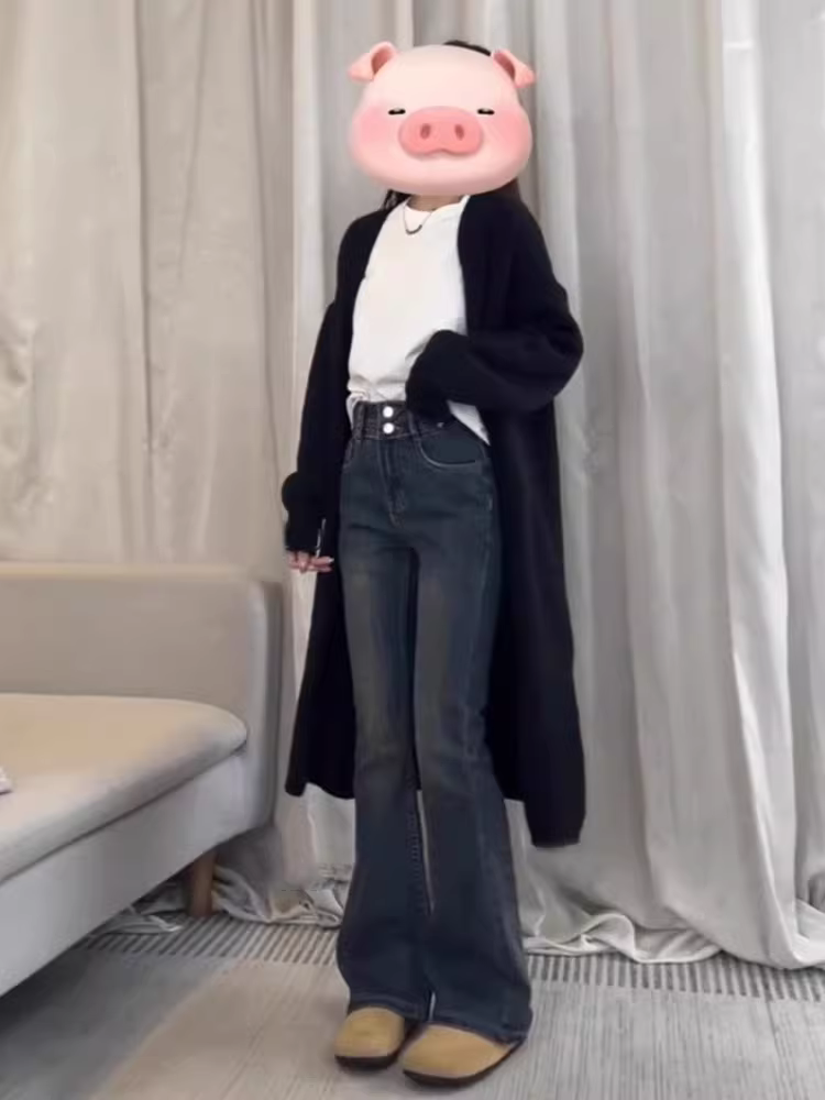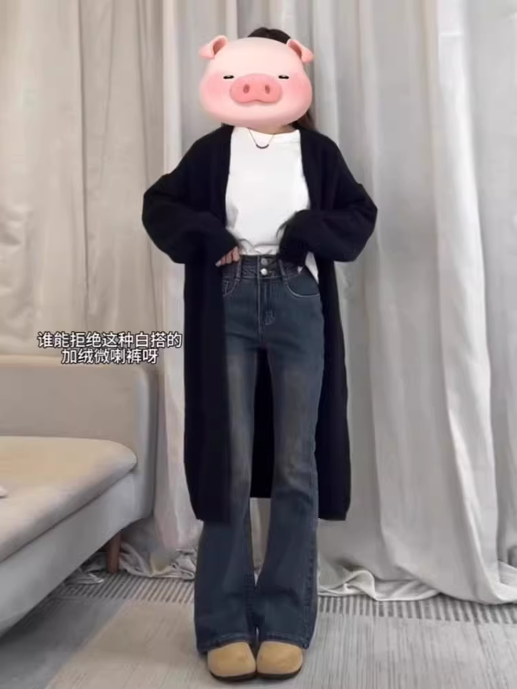 Quần jean nữ dáng rộng, cạp cao, chất liệu co giãn, lót lông cừu, thiết kế không bó sát chân, kiểu dáng che hông, dáng bootcut, size lớn, mùa đông