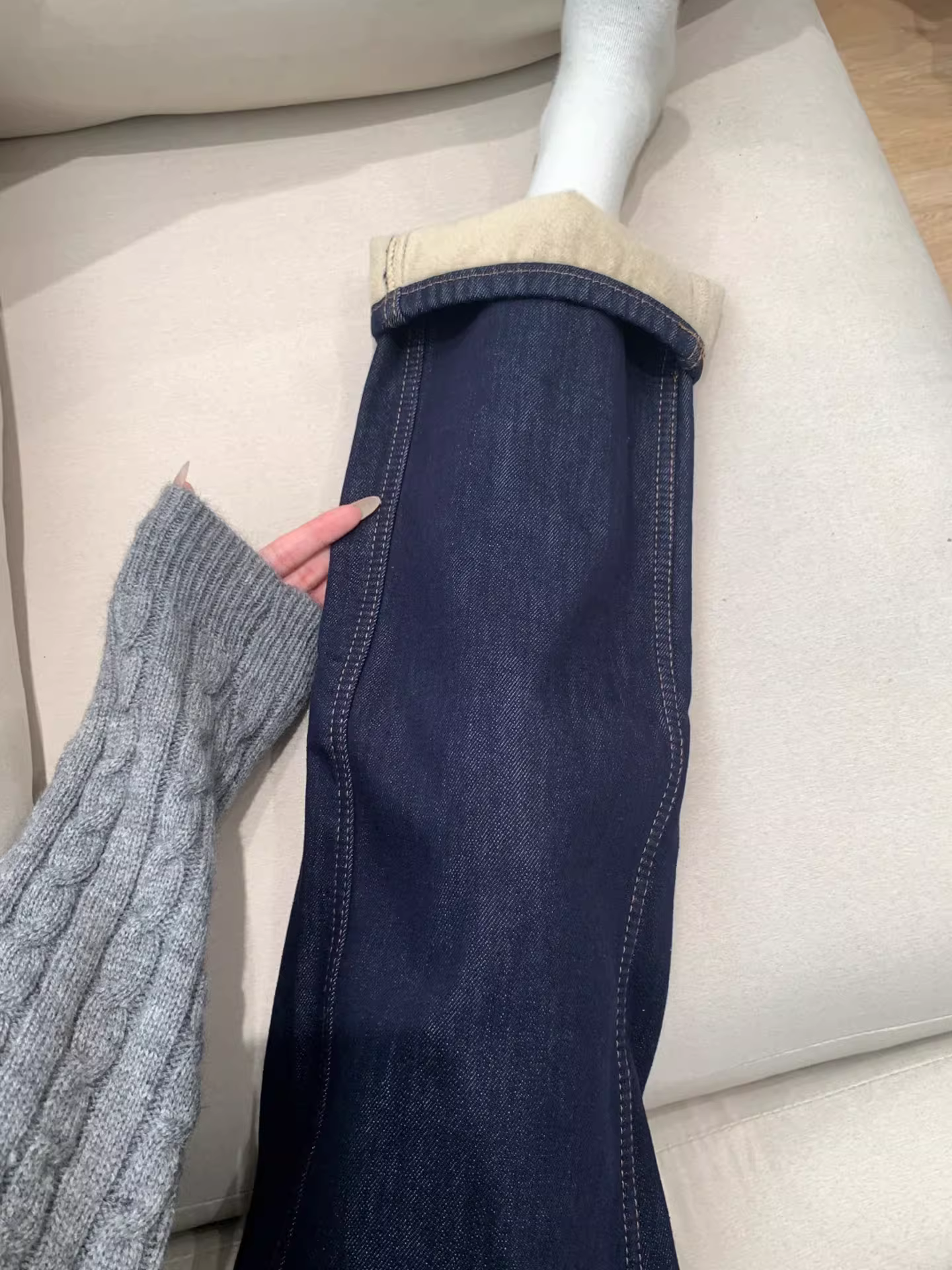 - Quần jean ống đứng dày dặn, lót lông cừu màu xanh đậm dành cho nữ, mùa đông, size lớn, cạp cao, tôn dáng, quần ống rộng giữ ấm.