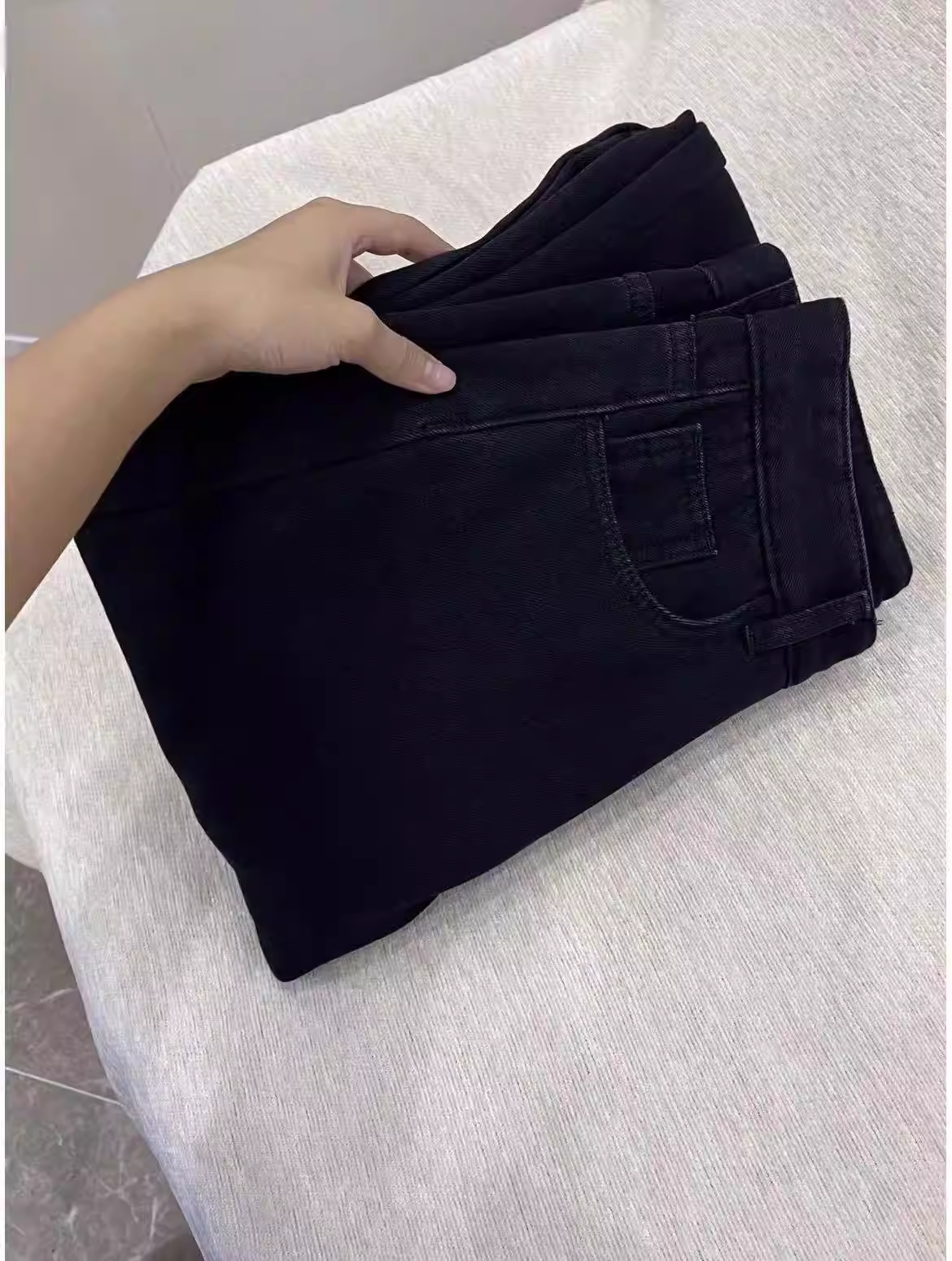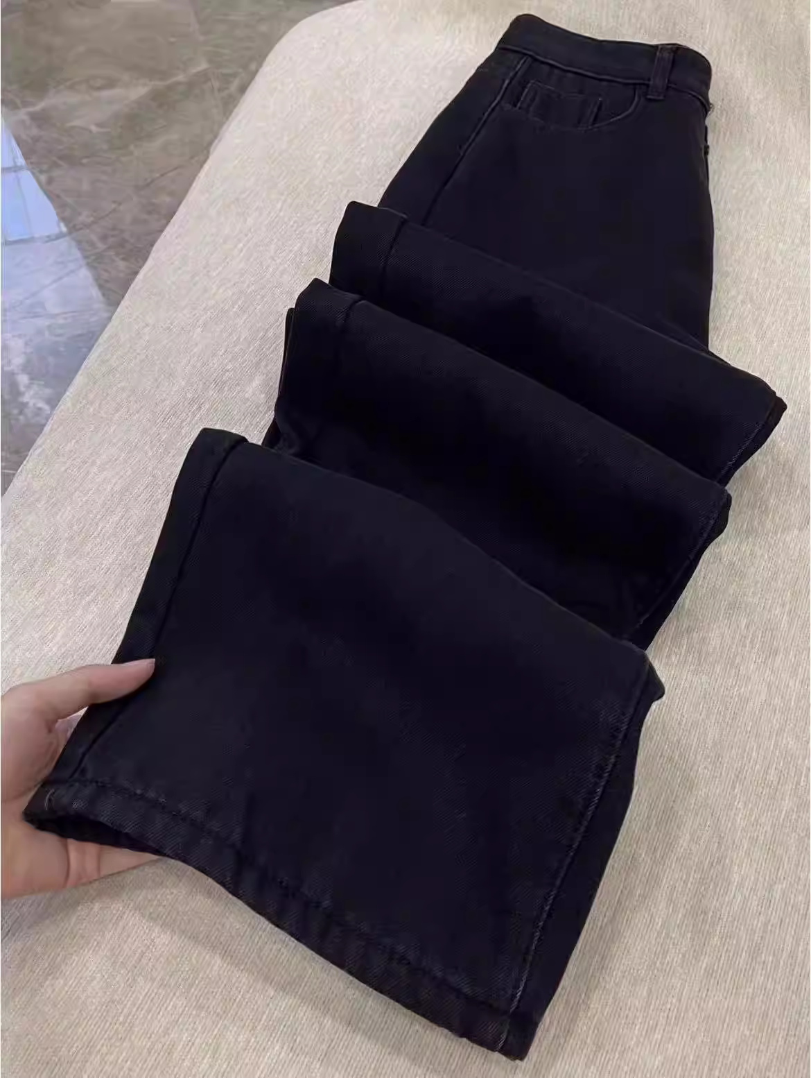 Quần jean ống đứng màu đen dành cho nữ, kiểu dáng thu đông mới, cỡ lớn, lót lông cừu, dày dặn, lưng cao, rộng rãi, tôn dáng, quần ống rộng.