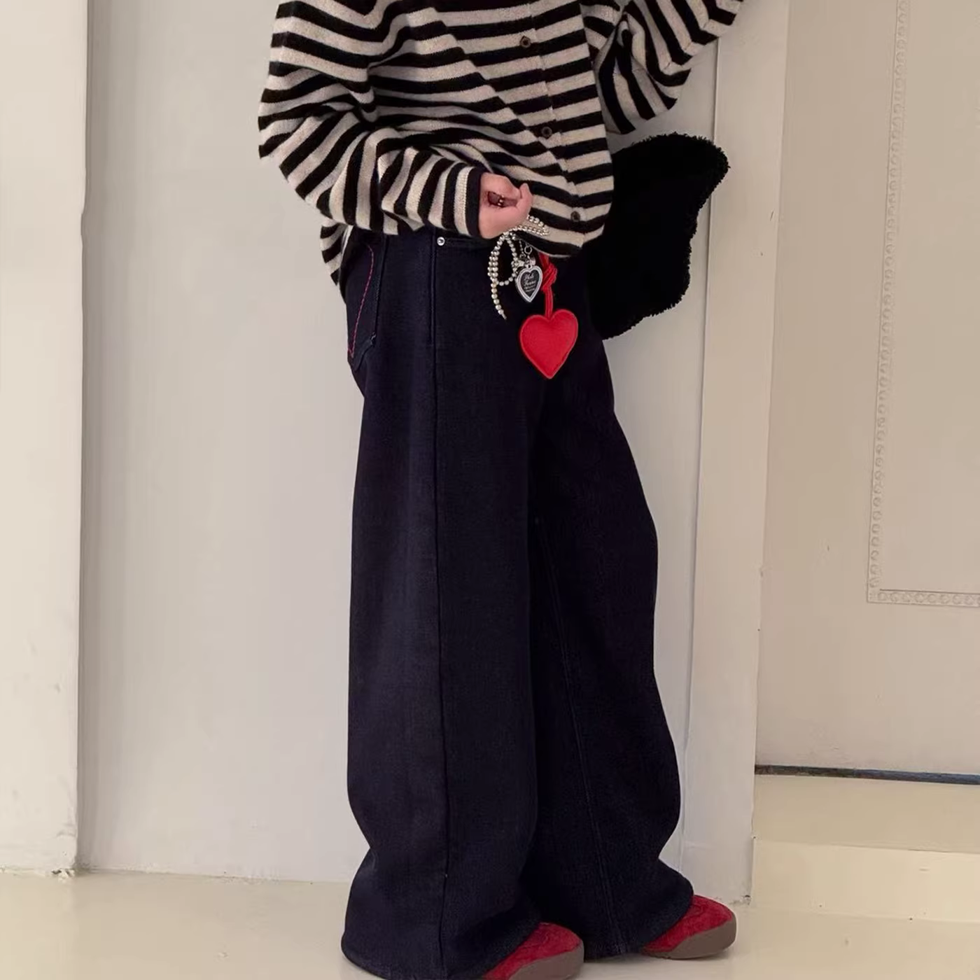 Quần jean ống thẳng dày dặn lót lông cừu cho bé gái, quần dài ống rộng dáng rộng mùa đông, quần dài đa năng, phong cách tích hợp lông cừu, hợp thời trang