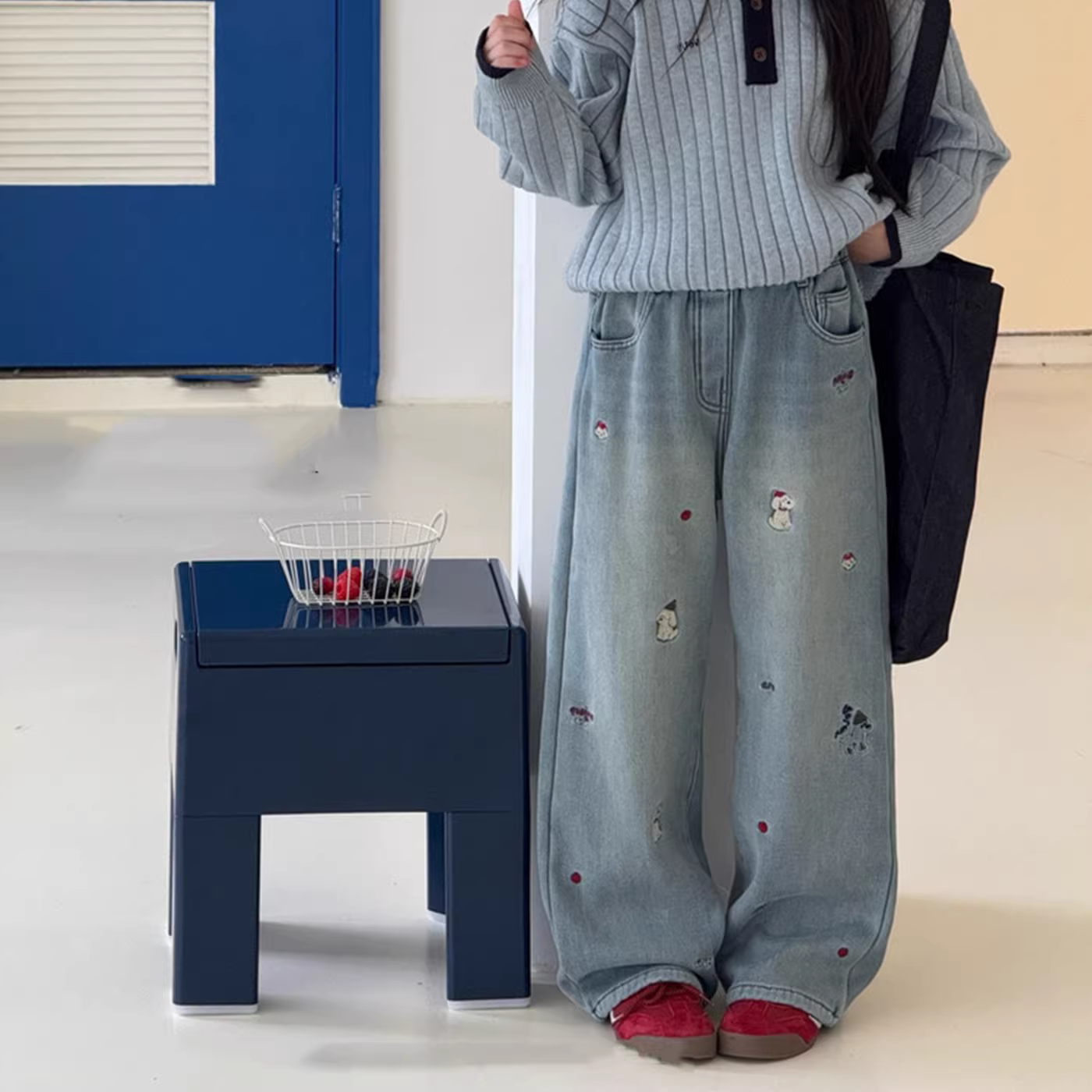 Quần jean ống thẳng lót lông cừu cho bé gái, mùa thu đông, quần thường ngày lót lông cừu cho trẻ lớn, quần ống rộng dáng rộng thời trang đa năng