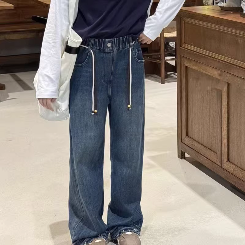Quần jean ống thẳng lót lông cừu dành cho bé gái có viền bo, quần ống rộng dáng rộng giản dị cho mùa thu đông, quần áo trẻ em giảm béo và tăng chiều cao, trang phục trẻ em hợp thời trang.
