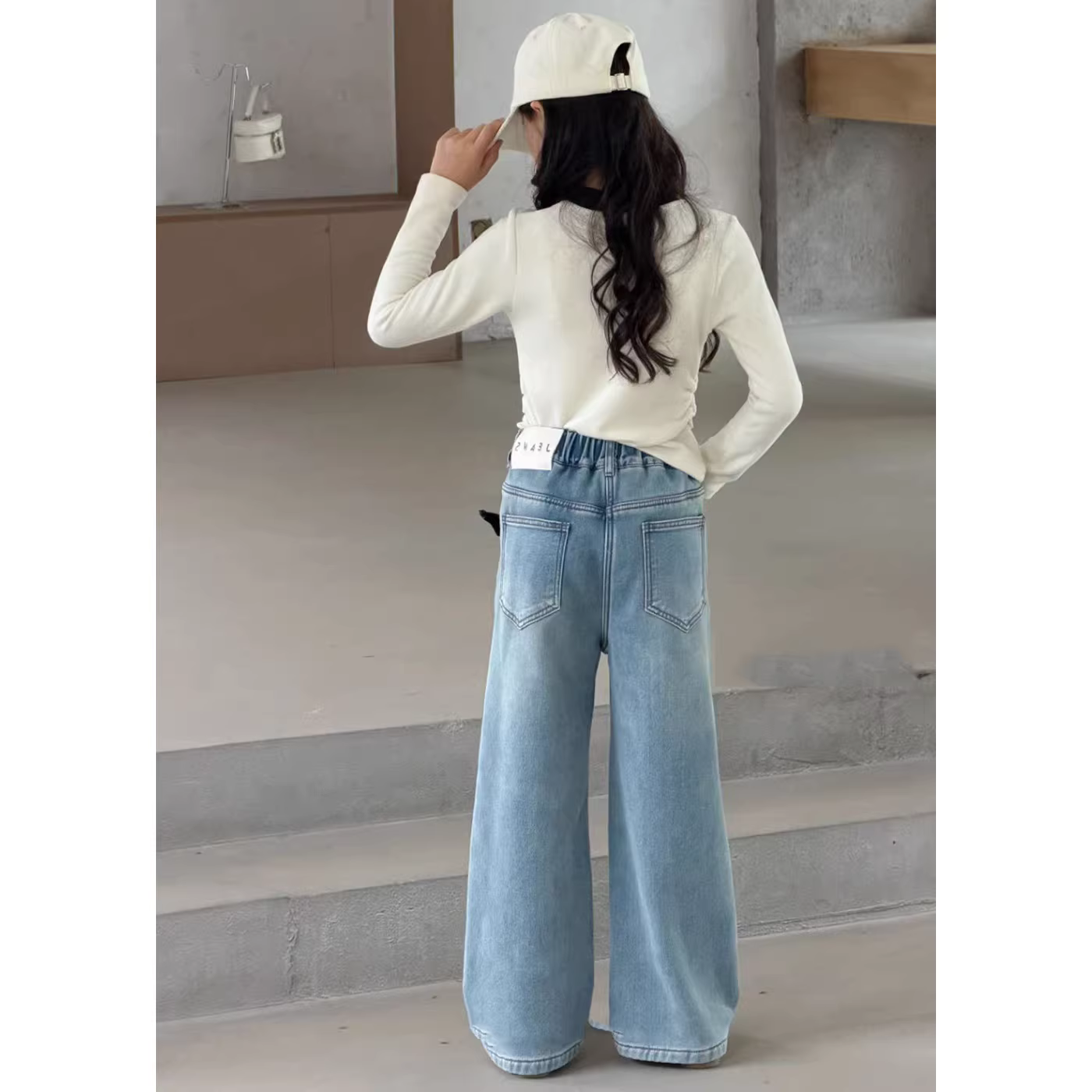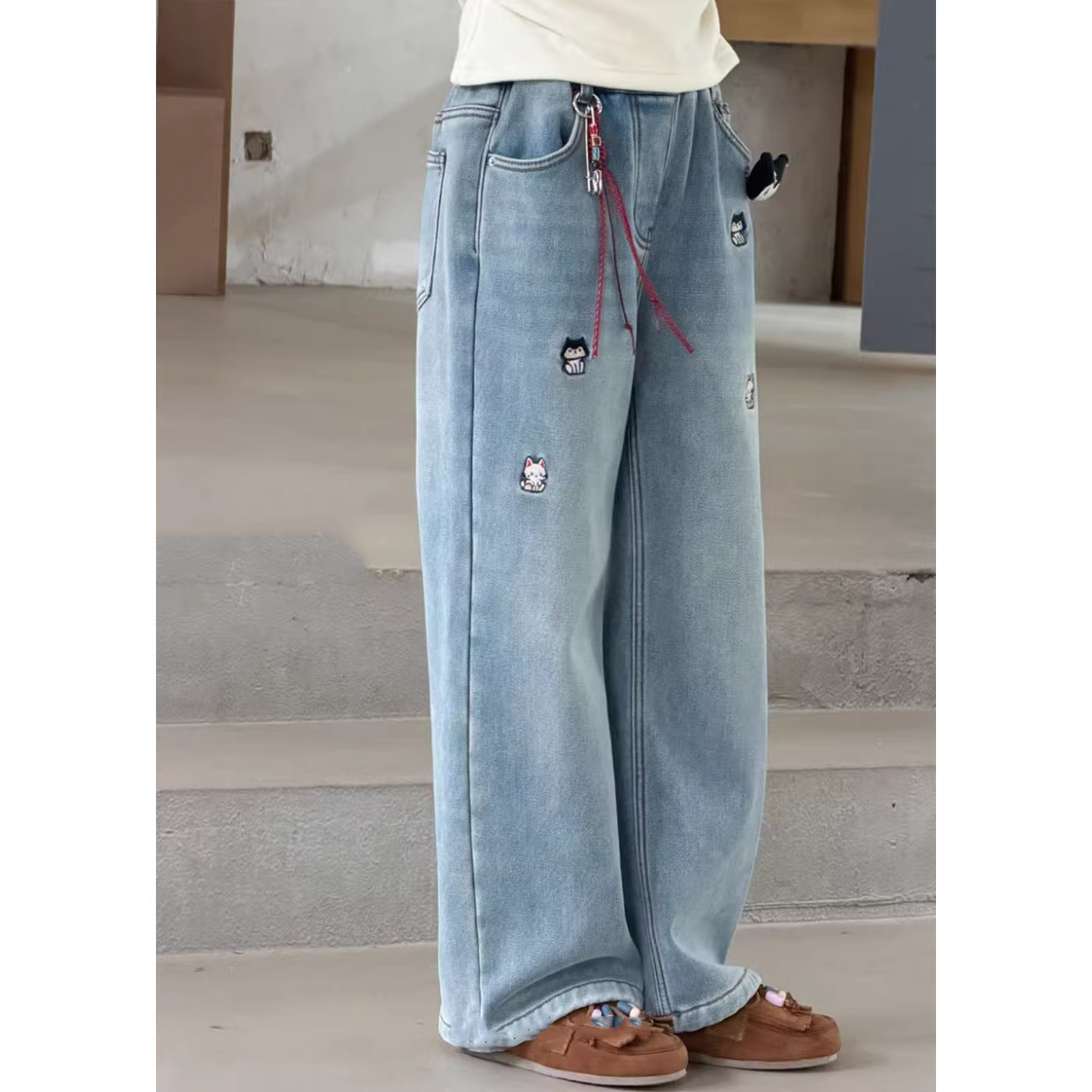 - Quần jean ống thẳng lót lông cừu dành cho bé gái, quần dài dáng rộng thường ngày mùa thu đông, quần ống rộng dày dặn dành cho trẻ lớn, đa năng và hợp thời trang.