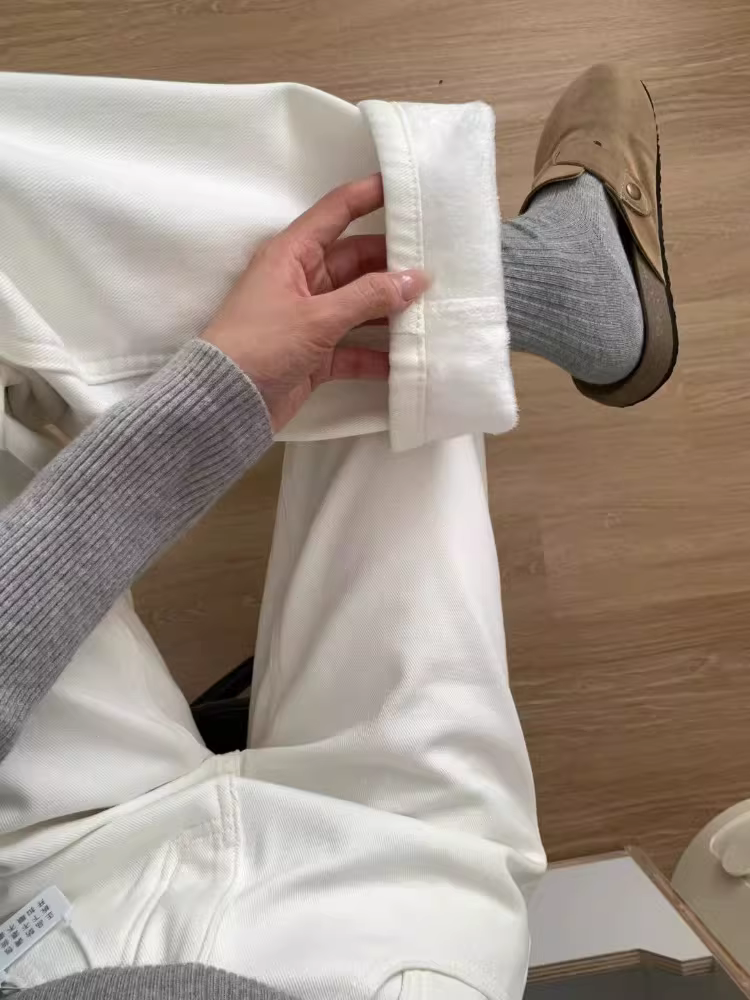 - Quần jean trắng cạp cao ống thẳng dành cho nữ, mùa thu đông, lót lông cừu, dày, cỡ lớn, cạp cao, mềm mại, tôn dáng, quần ống rộng.