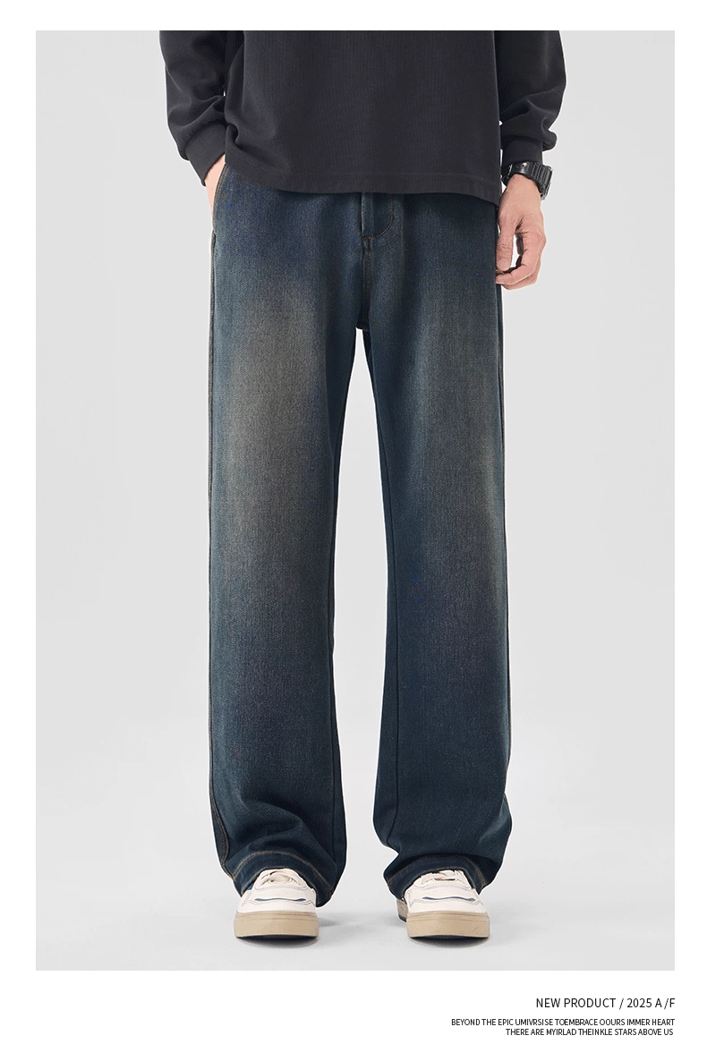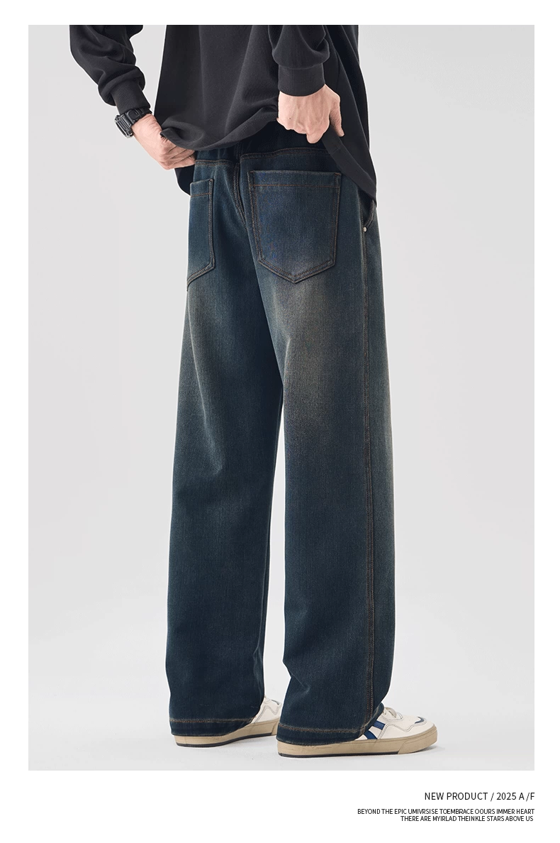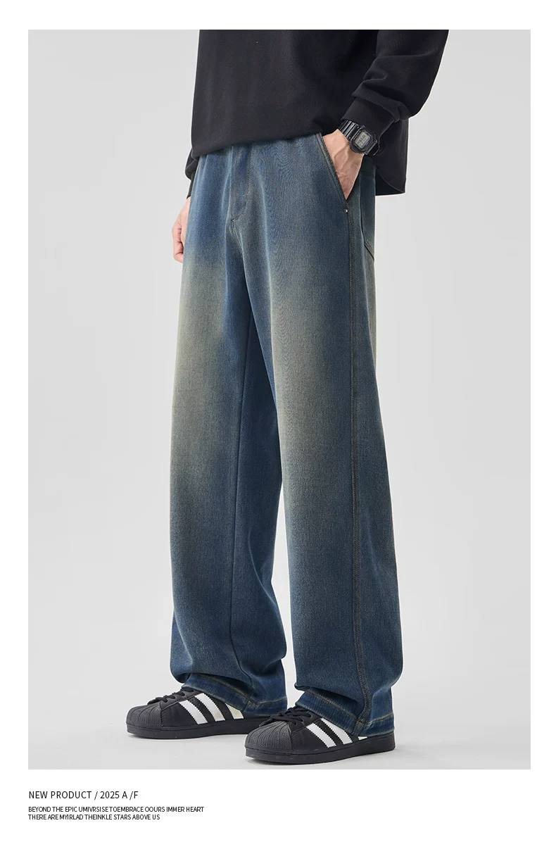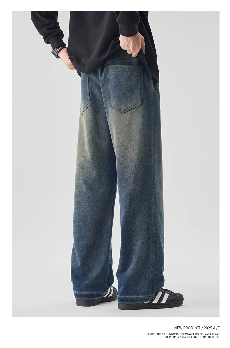 - Quần jean xanh cổ điển OMZM dành cho nam, quần ống rộng dáng rộng mùa thu đông, quần công sở cổ điển giặt nặng kiểu Mỹ