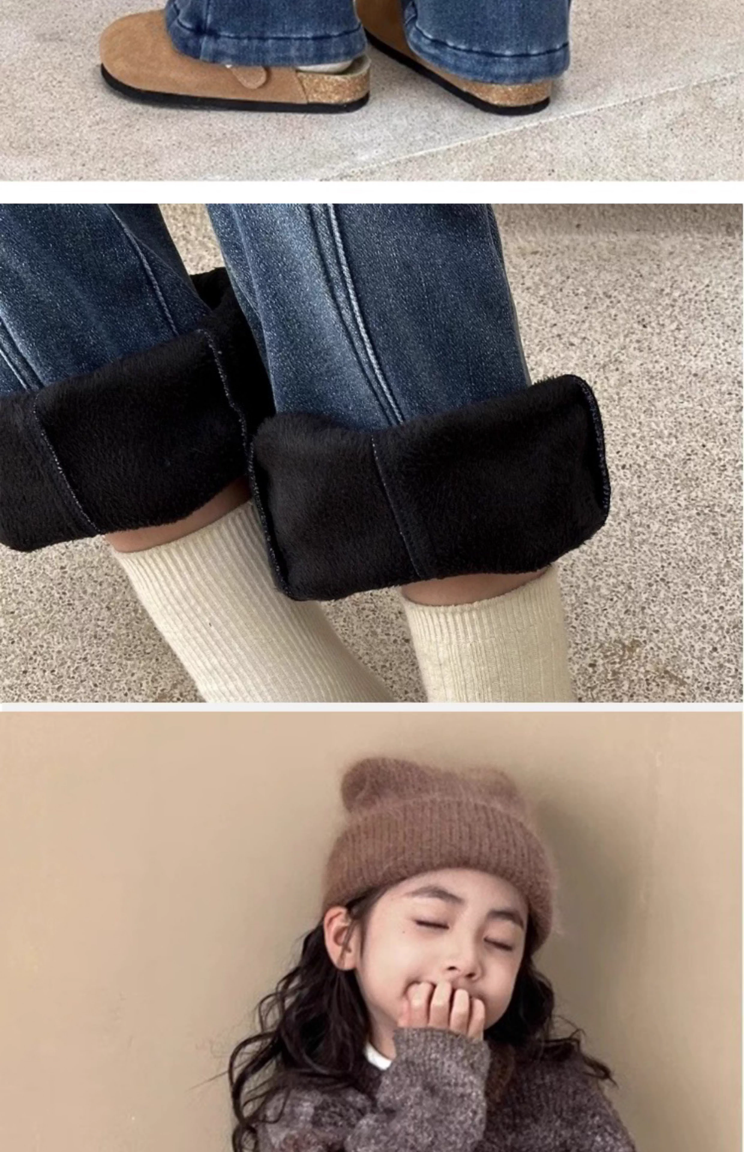 - Quần jeans kiểu Hàn Quốc cho trẻ lớn, kiểu mới mùa đông 2025, quần lót lông cừu, quần ống loe lưng cao co giãn cho bé gái, kiểu dáng thời thượng.
