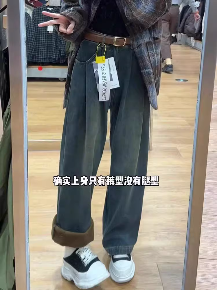 - Quần jeans màu xám xi măng cổ điển dành cho nữ mùa thu đông 2025, size lớn, chất liệu dày lót lông, cạp cao, che hông, dáng rộng, tôn dáng