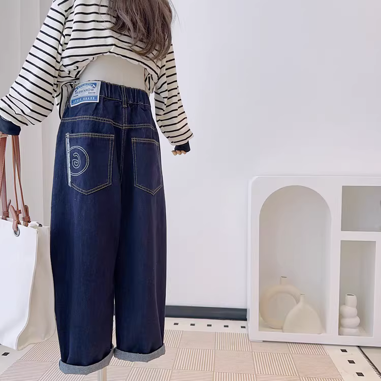 - Quần jeans ống đứng trẻ em, quần áo trẻ em thu đông 2025, quần bé trai lót lông cừu, quần ống rộng tua rua, quần cà rốt, dáng rộng, dành cho học sinh