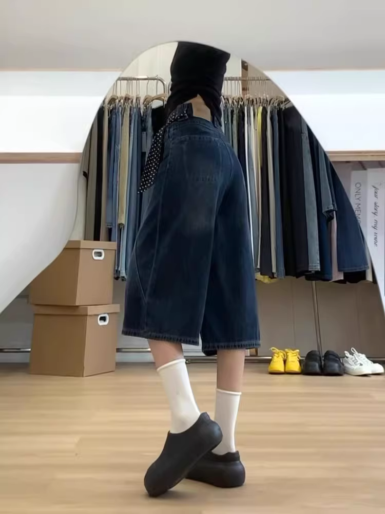 Quần jeans ống rộng màu xanh đậm dành cho nữ, kiểu mùa hè 2025, size nhỏ và size lớn, cạp cao, dáng rộng, tôn dáng, quần ống thẳng dài đến giữa bắp chân.
