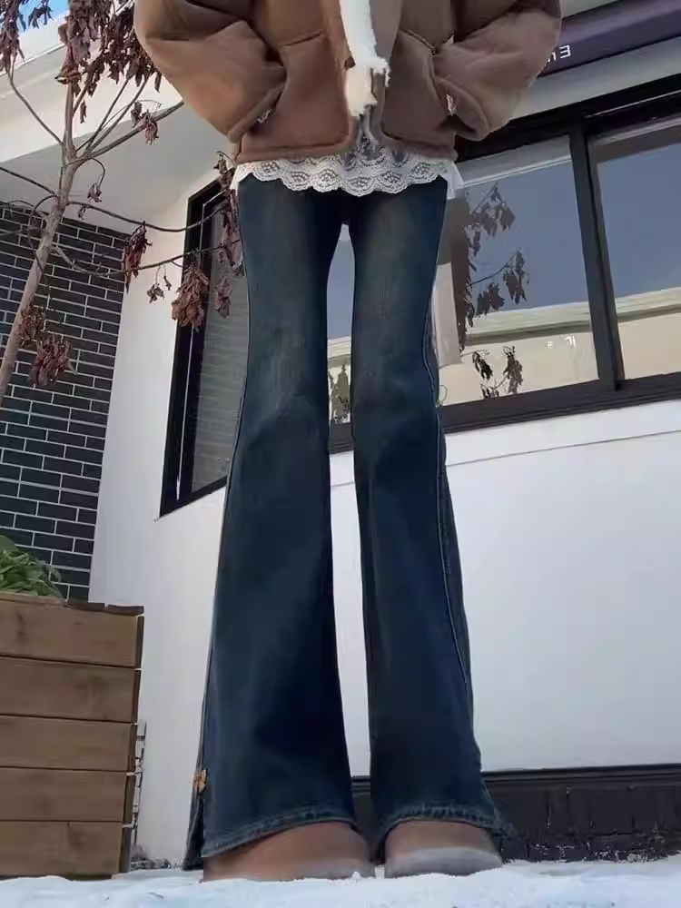 - Quần jeans xẻ tà vintage nữ size lớn mùa xuân 2025, cạp cao, co giãn, tôn dáng, kiểu chuông