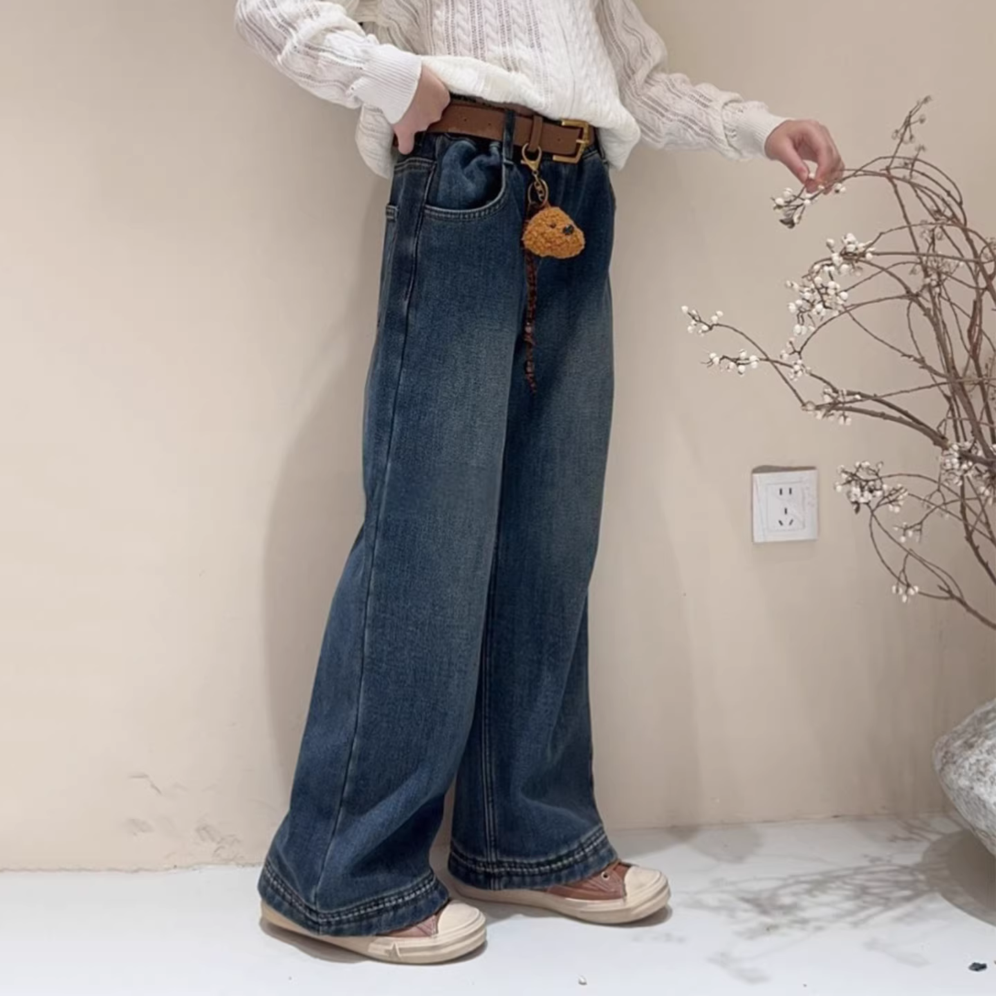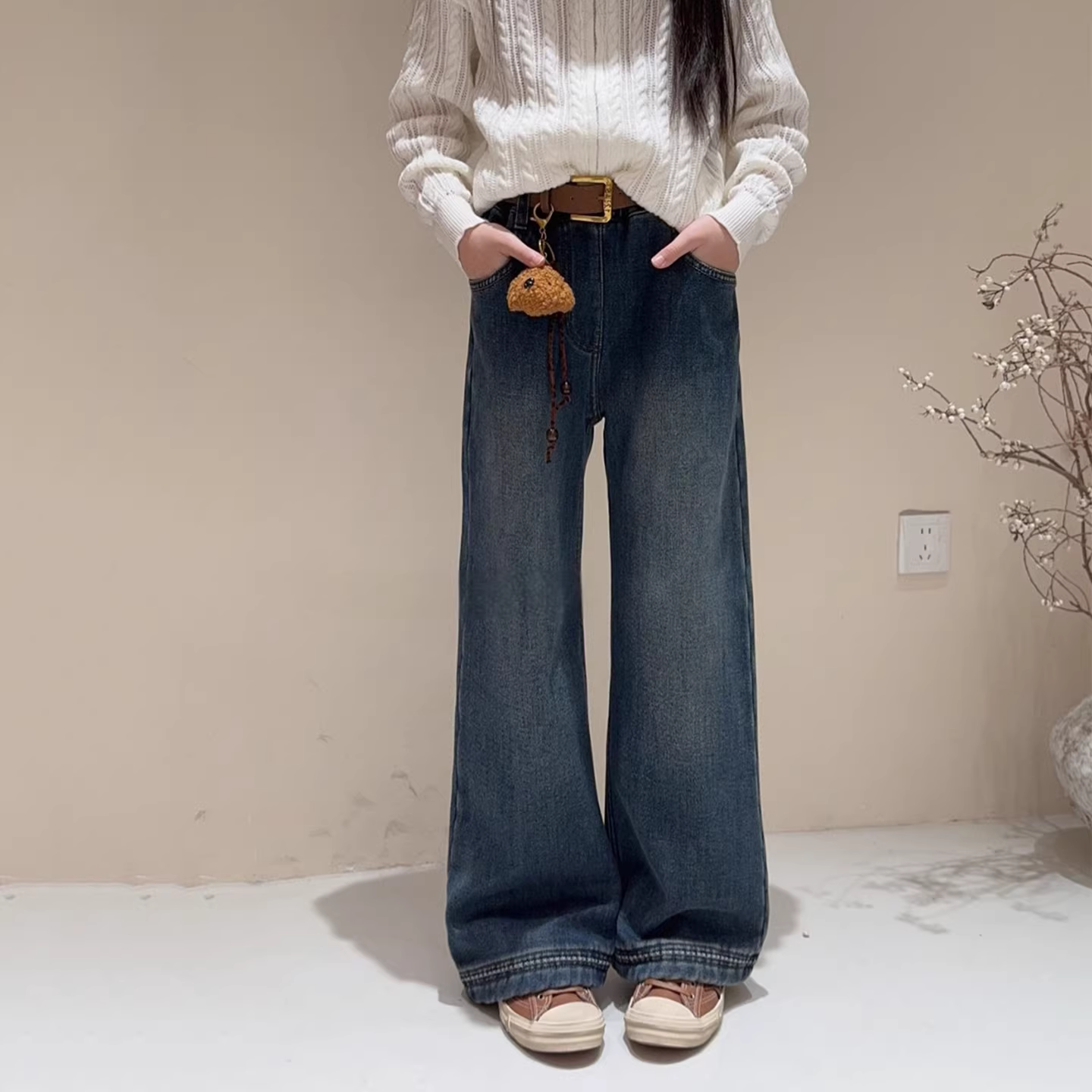 - Quần ống rộng dáng thẳng đa năng mùa đông 2025 dành cho trẻ lớn, quần jean lót lông cừu cho bé gái, kiểu dáng thời trang