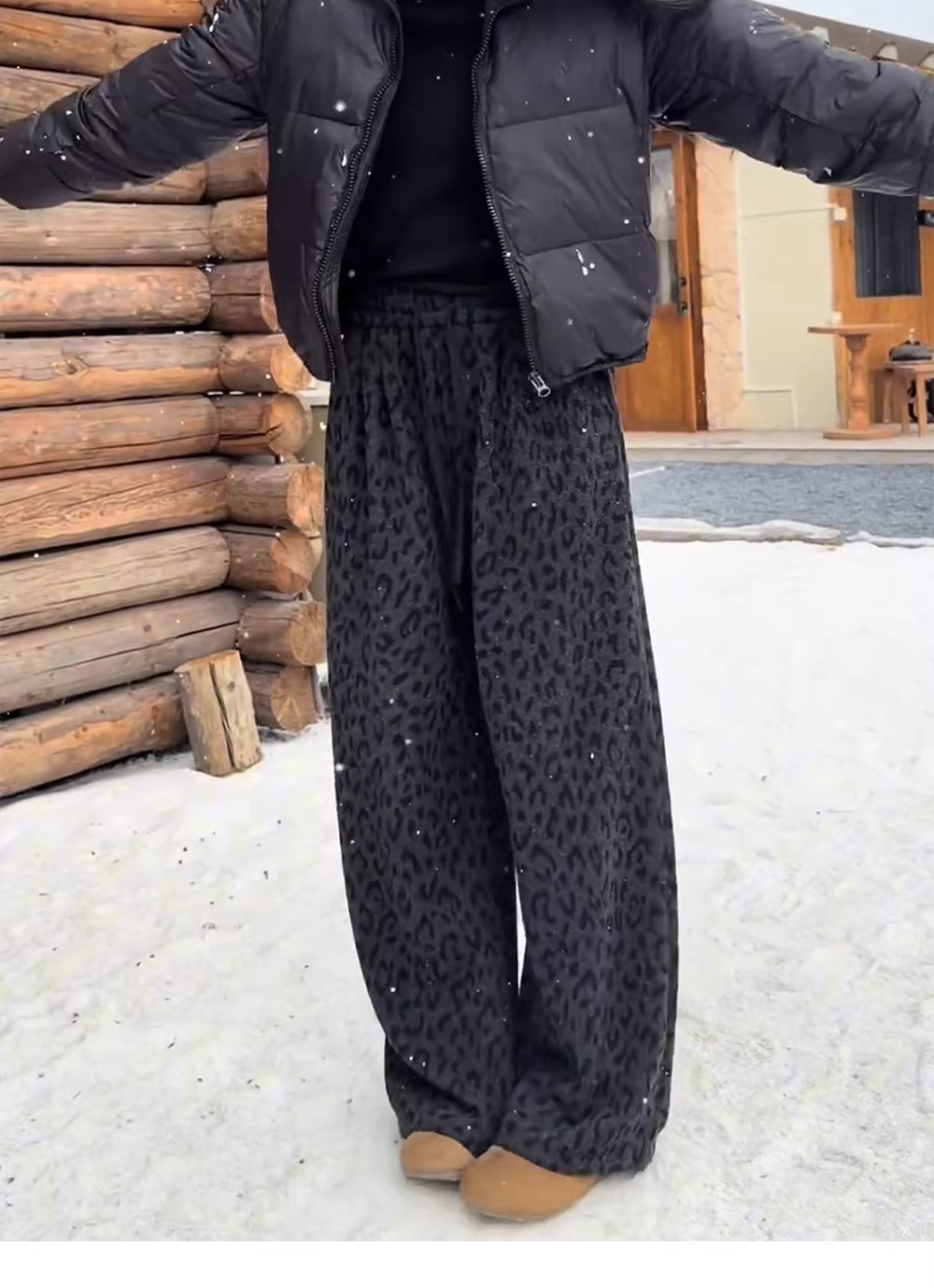 - Quần ống rộng họa tiết da báo dành cho nữ, mùa thu đông, cỡ lớn, lót lông cừu, dày dặn, lưng cao, dáng rộng, giảm béo, phong cách lười biếng, quần ống thẳng.