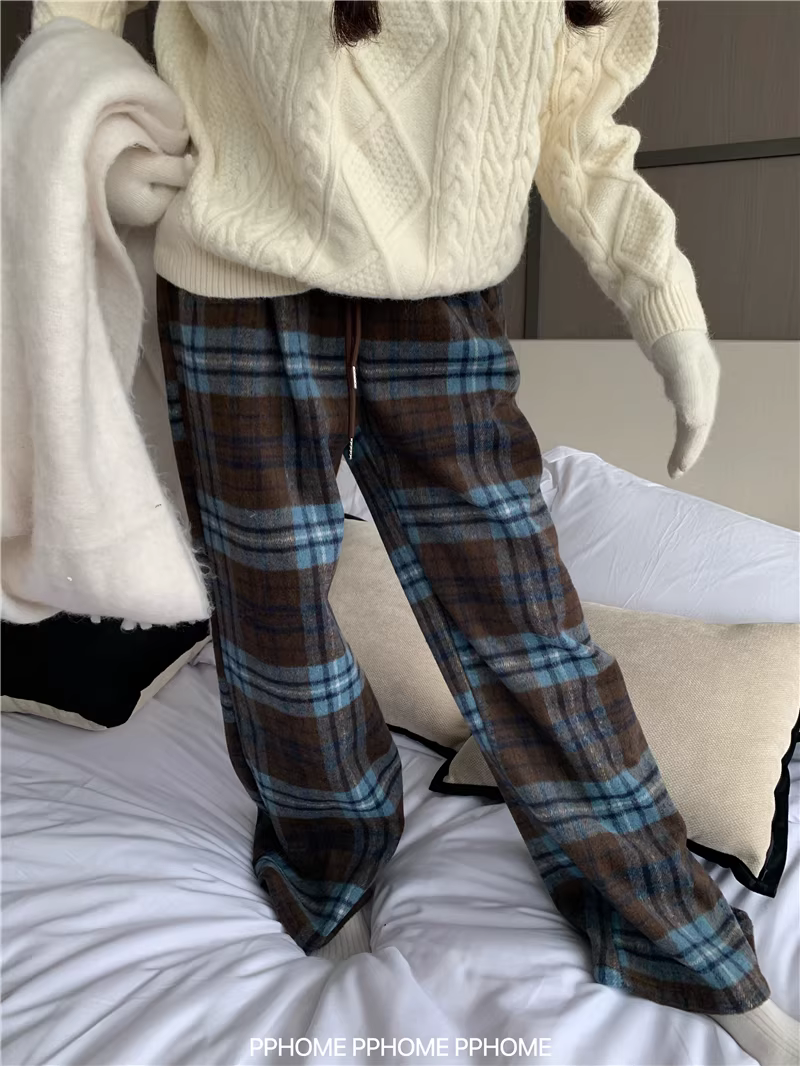- Quần ống rộng kiểu cổ điển kẻ sọc dành cho nữ, mùa thu đông, lót lông cừu, dày, cỡ lớn, lưng cao, rộng rãi, quần len mềm mại.