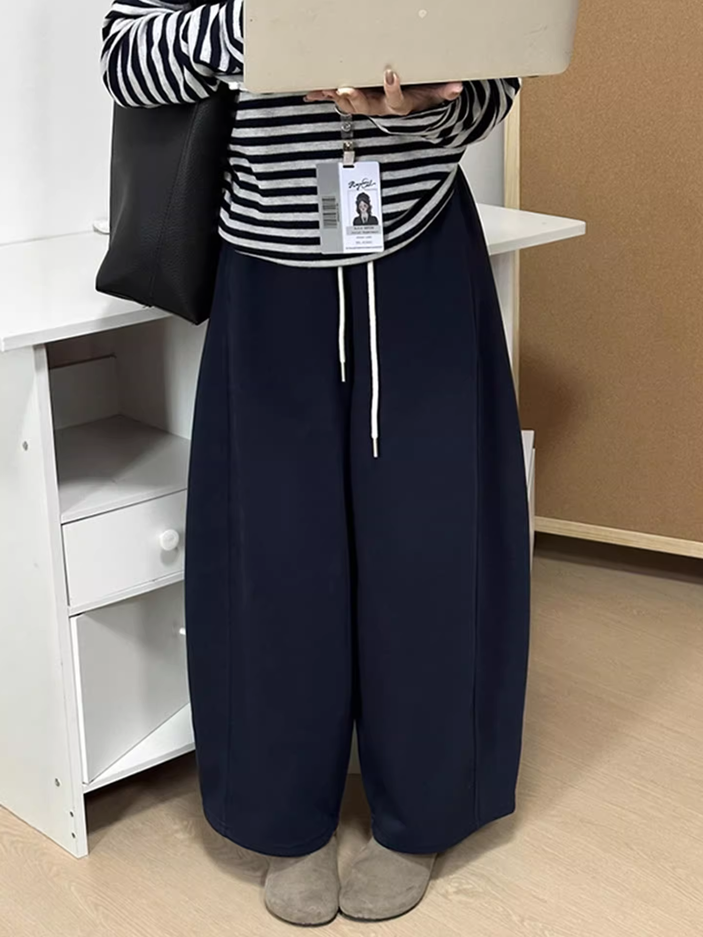 - Quần ống rộng màu xanh hải quân dành cho nữ, kiểu dáng mùa thu mới, cỡ lớn, lưng cao, dáng rộng, tôn dáng, quần chín phần thông thường.