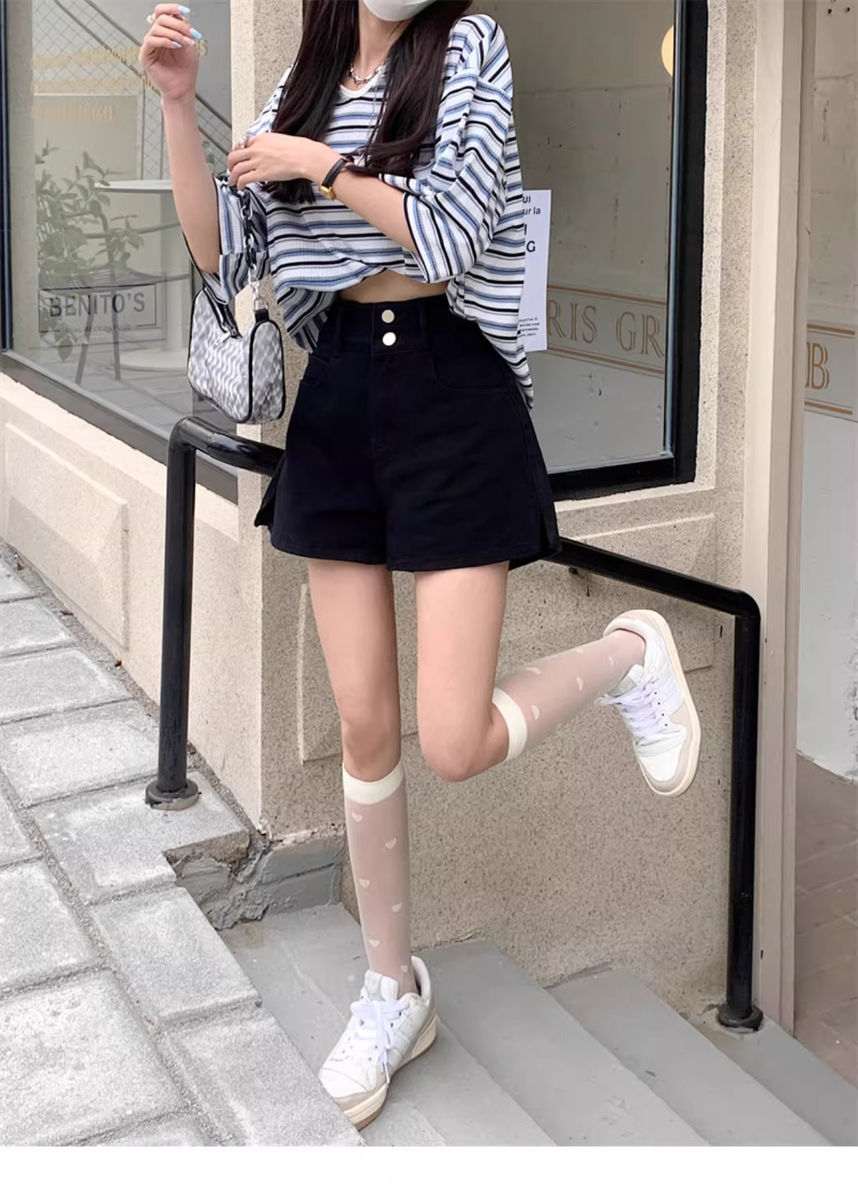 - Quần short denim đen dành cho nữ, cỡ lớn mùa hè, lưng cao, dáng rộng, tôn dáng, dành cho người có thân hình quả lê, quần ống rộng dáng chữ A.