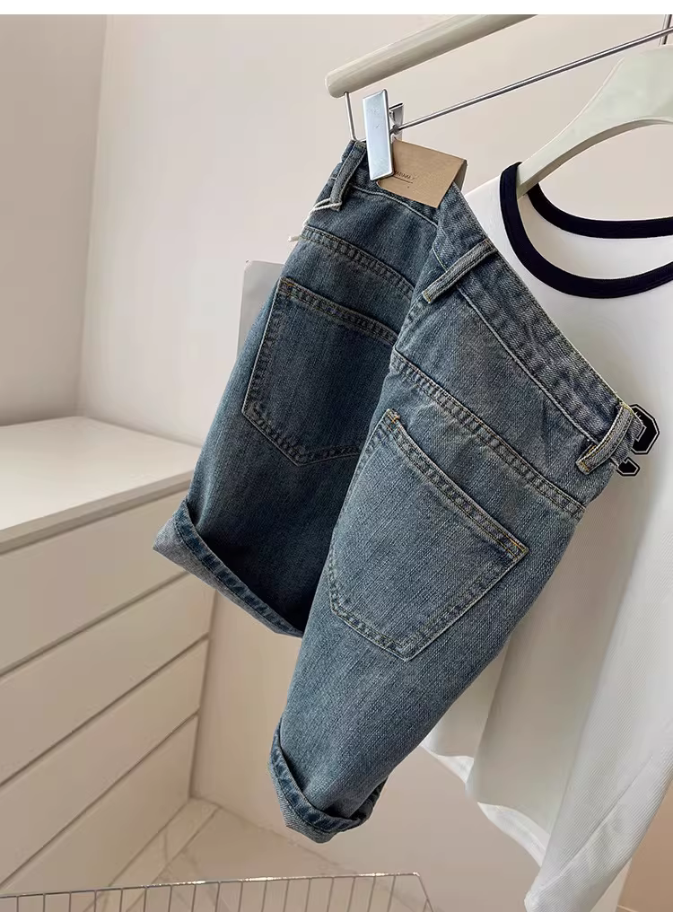 - Quần short denim ống đứng cổ điển dành cho nữ, kiểu dáng mỏng mùa hè, cỡ lớn, lưng cao, dáng rộng, tôn dáng, quần short dài vừa phải kiểu chữ A.