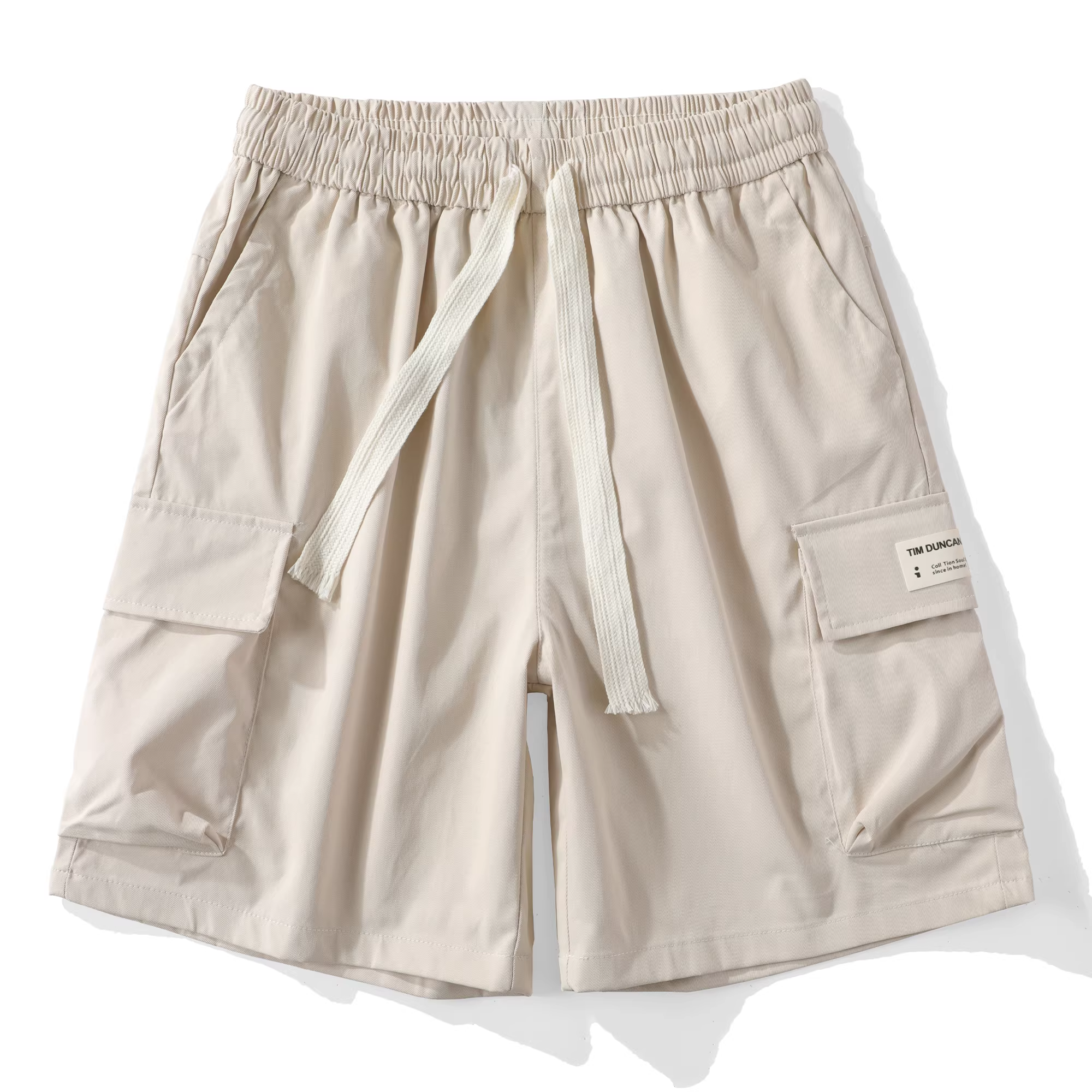 Quần short nam phong cách thường ngày có nhiều túi và nhãn hiệu, quần short dài vừa phải màu trơn, quần short năm điểm, quần nhiều túi thời trang.