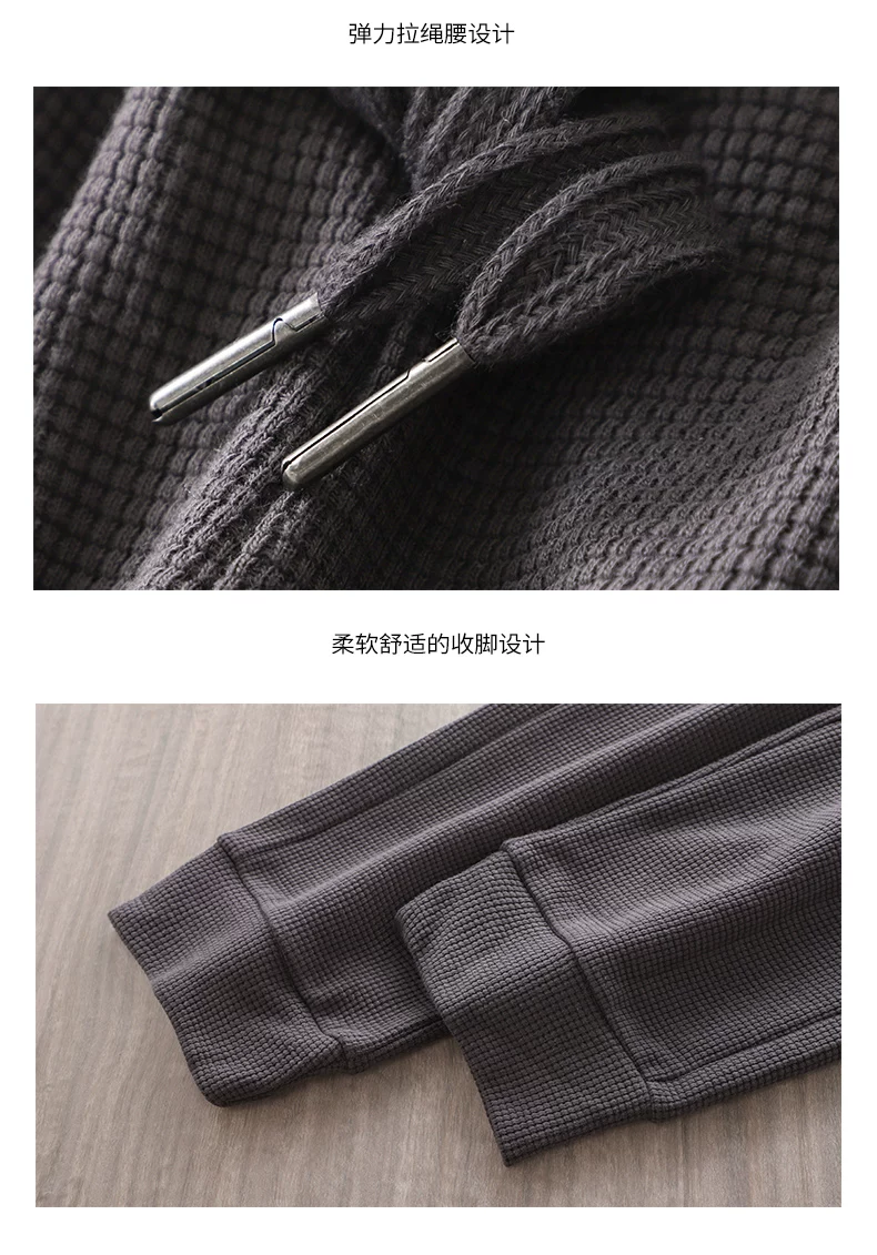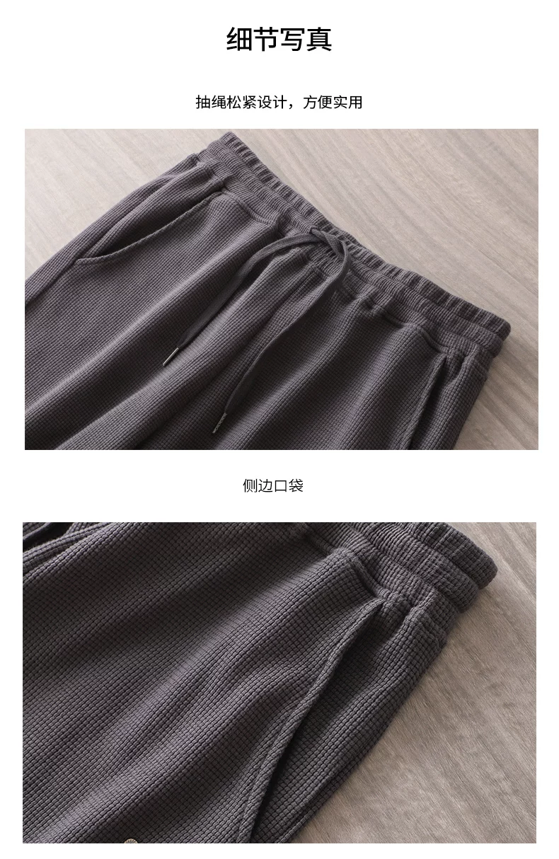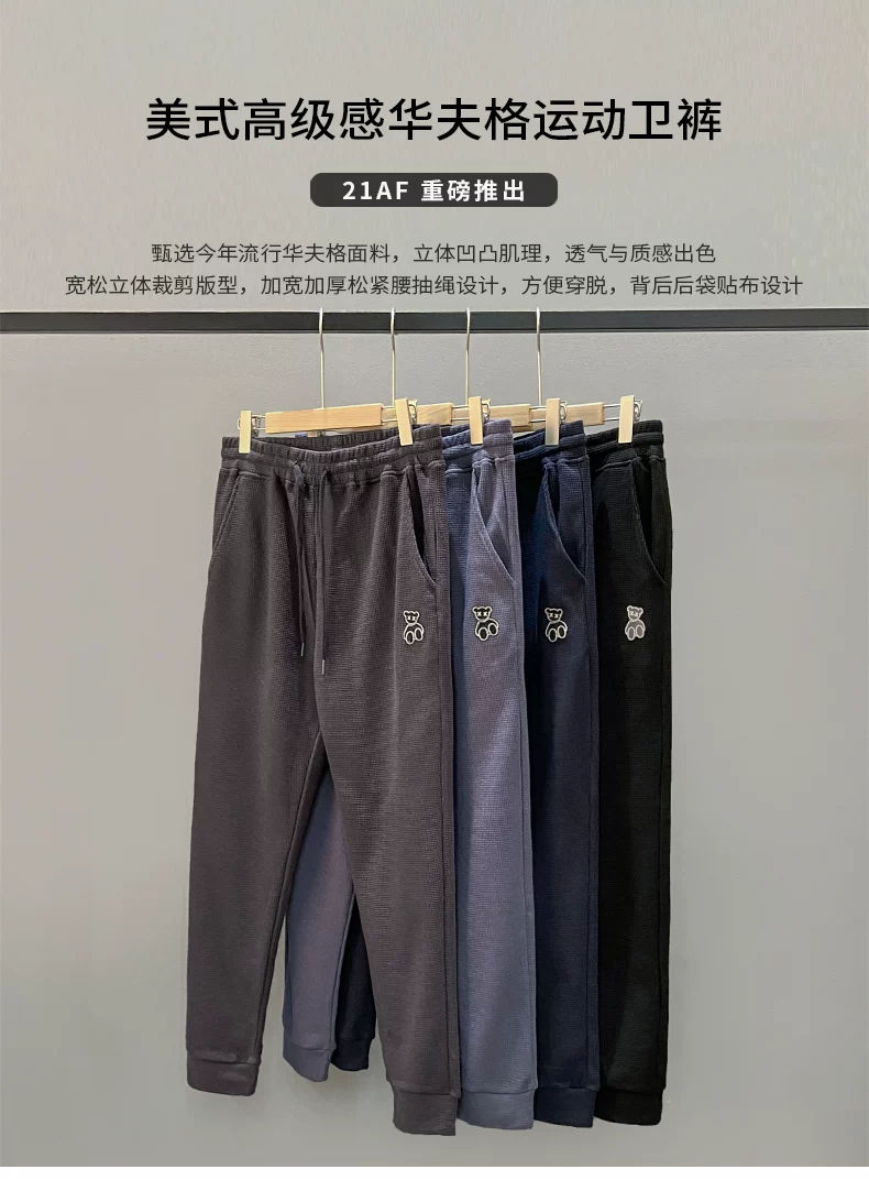 Quần thể thao nam chất liệu vải waffle thêu hình gấu kiểu Mỹ, mùa xuân thu, dáng rộng, dây rút mỏng, cảm giác cao cấp, quần jogger thường ngày.
