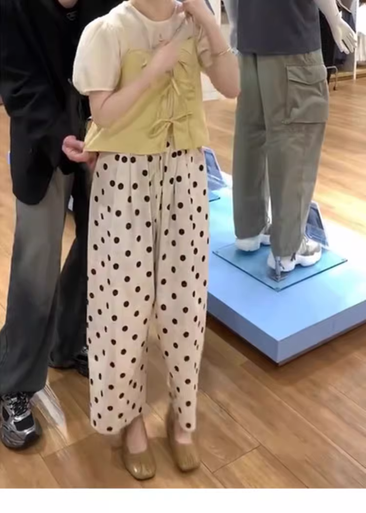 - Quần thường ngày chấm bi cho nữ, cỡ lớn mùa hè, quần Yamamoto, lưng cao, dáng rộng, giảm béo, quần ống rộng, quần bóng.