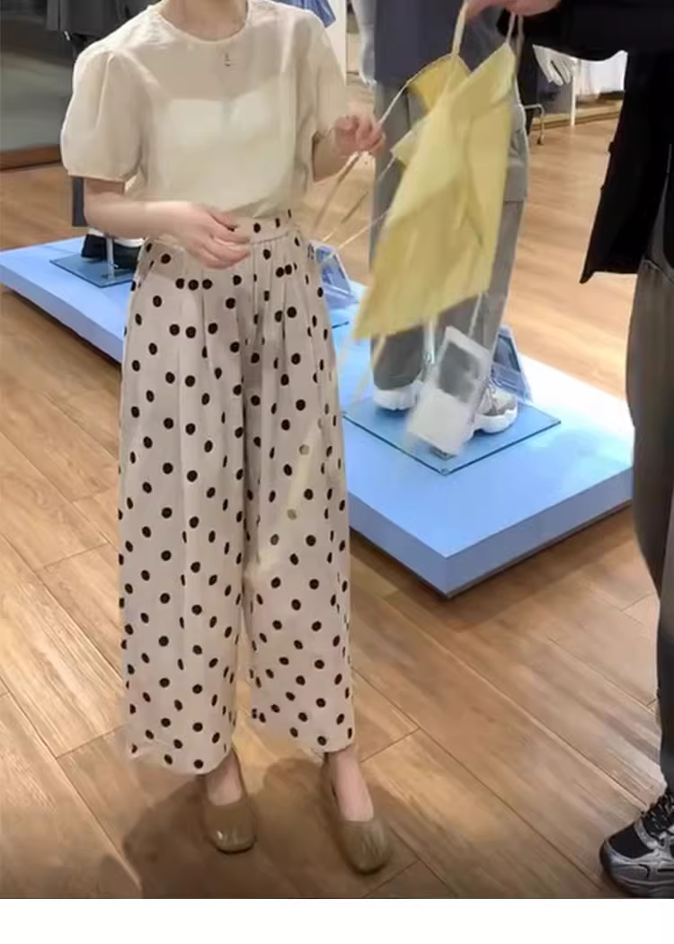 Quần thường ngày chấm bi cho nữ, cỡ lớn mùa hè, quần Yamamoto, lưng cao, dáng rộng, giảm béo, quần ống rộng, quần bóng.