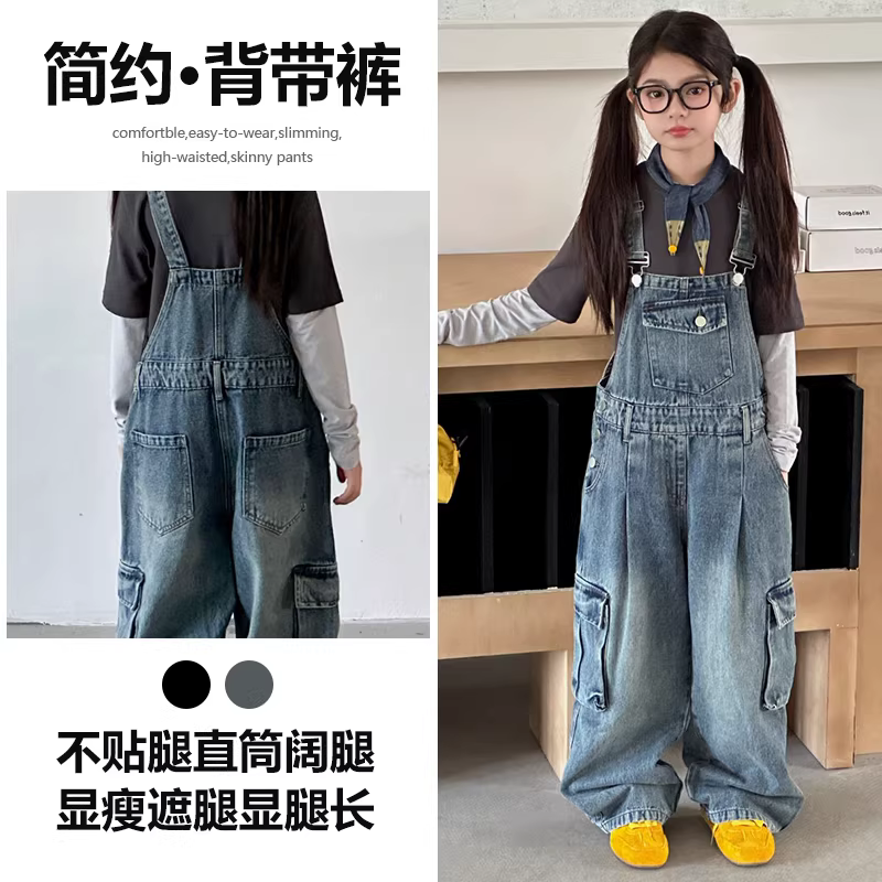 - Quần yếm denim dành cho bé gái trang phục mùa thu Bộ đồ bảo hộ lao động dành cho trẻ lớn hơn, quần có dây đeo, quần ống rộng dáng rộng kiểu dáng hợp thời trang dành cho trẻ em