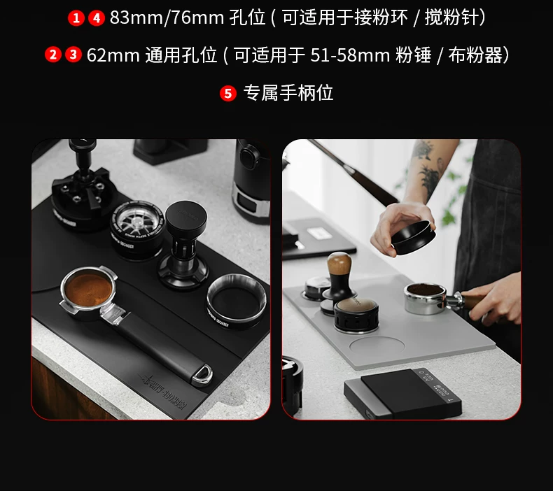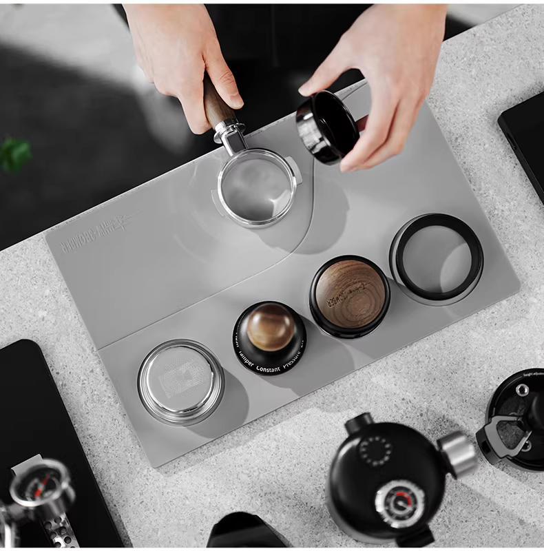 Tấm lót quầy bar, tay cầm máy pha cà phê, búa đánh bột, khăn lau, hộp đựng bột, thảm silicon, thảm tamping, dòng Bomber MHW