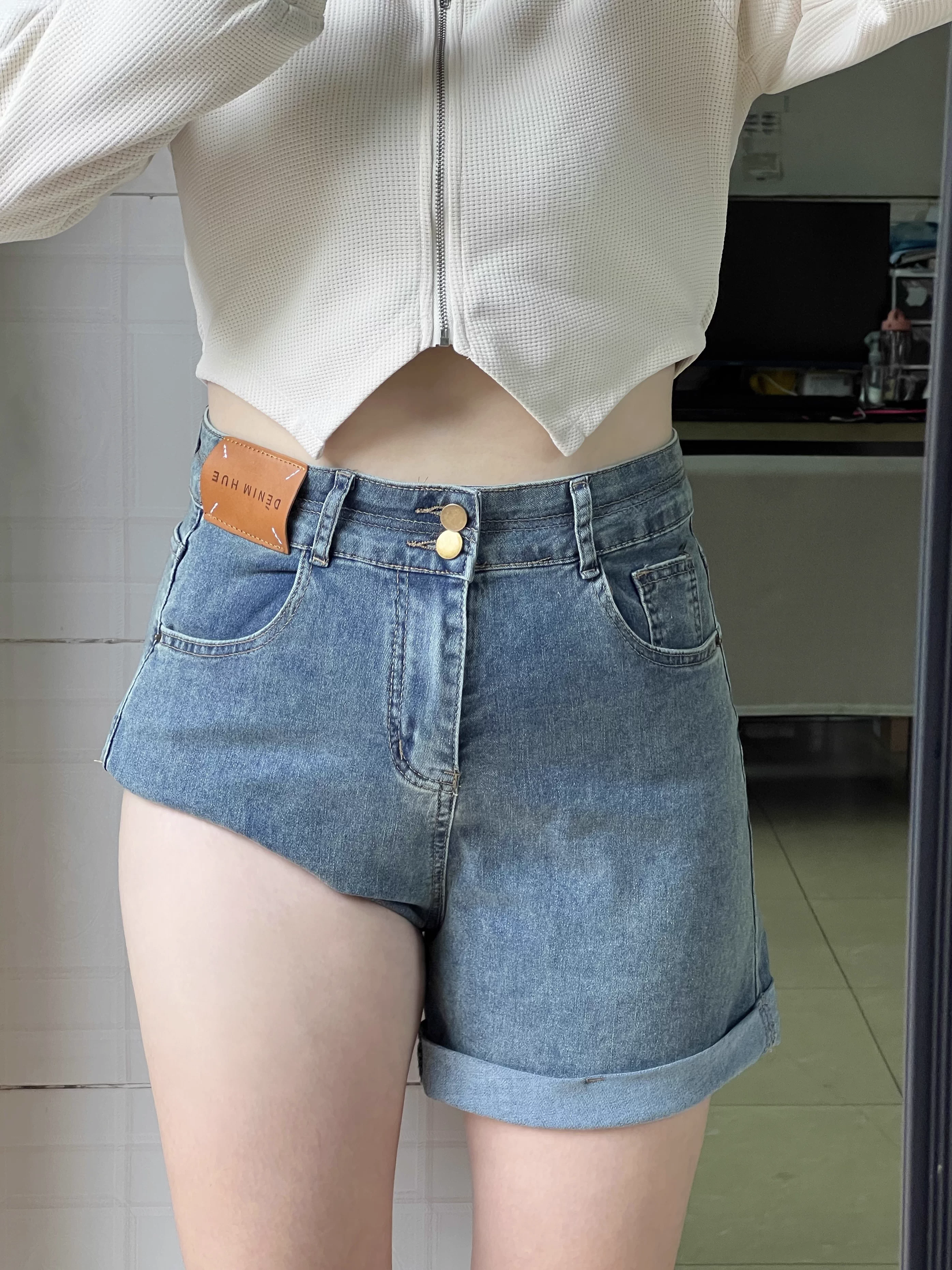 - Thân hình quả lê, quần short denim viền cuốn dành cho nữ, cỡ lớn mùa hè, lưng cao, co giãn, che hông, quần ống rộng chữ A tôn dáng