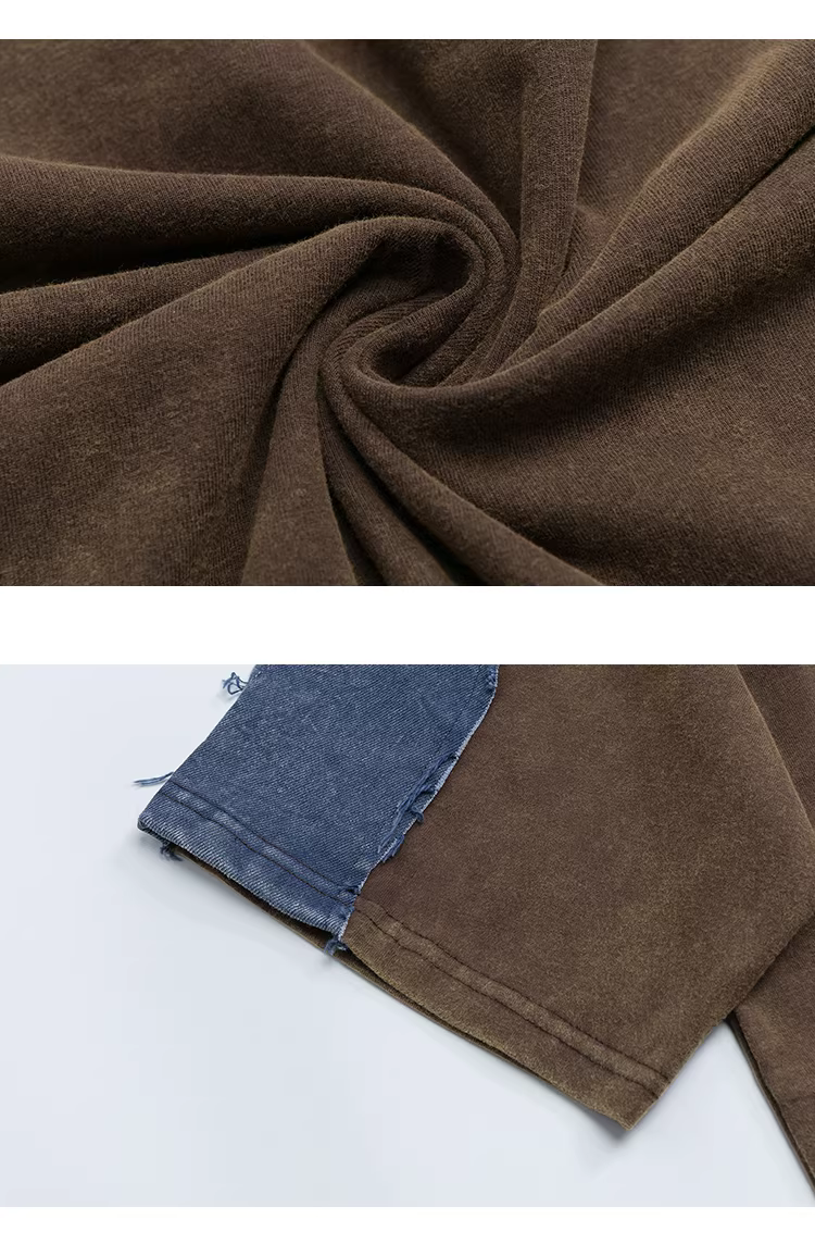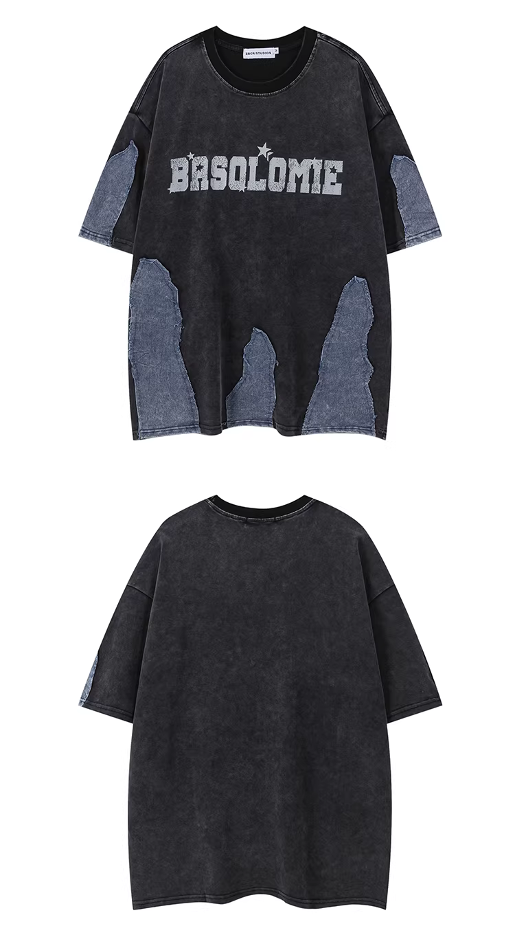 - Từ sao Hỏa, ngày đêm, phong cách retro Mỹ, áo thun ngắn tay kiểu cũ với chất liệu denim ghép mảnh và in chữ, phong cách BF.