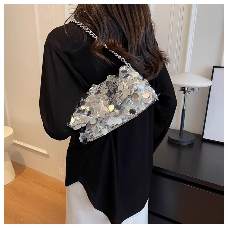 Túi xách thiết kế độc đáo dành cho nữ 2025, mẫu mới thu đông, đa năng, đeo vai, đeo chéo, đính sequin, cao cấp, dây xích, túi vuông nhỏ