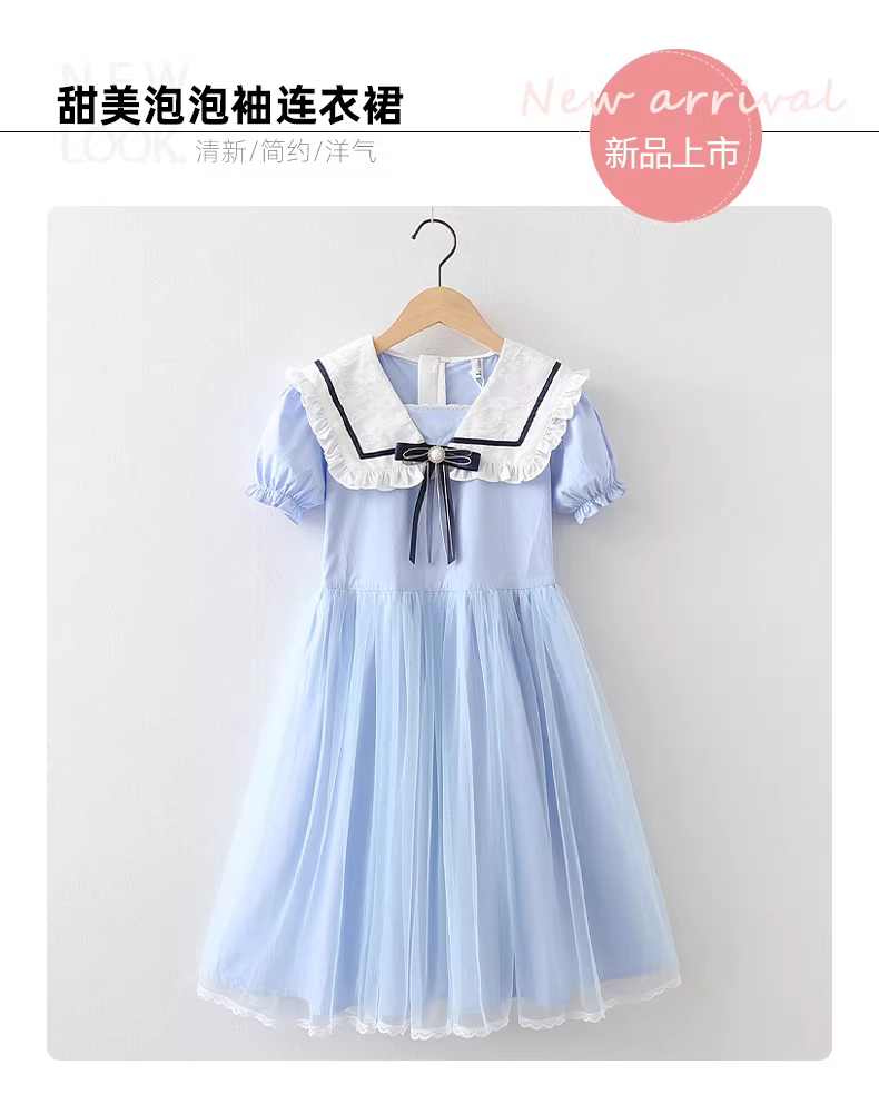 Váy xanh cho bé gái mùa hè 2025, kiểu dáng preppy mới cho trẻ lớn, có cổ, kiểu công chúa