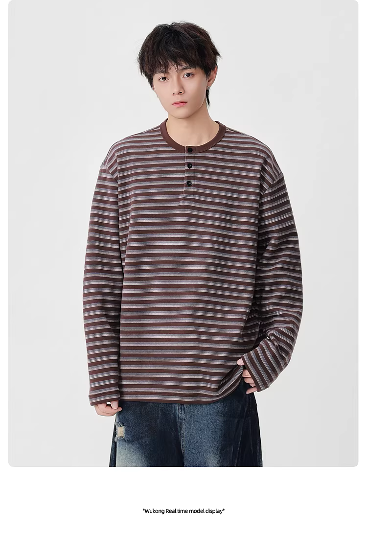- Wukong có sẵn áo thun cổ Henry sọc vintage mùa thu dành cho nam, áo thun dài tay dáng rộng phong cách thời trang dành cho cặp đôi.