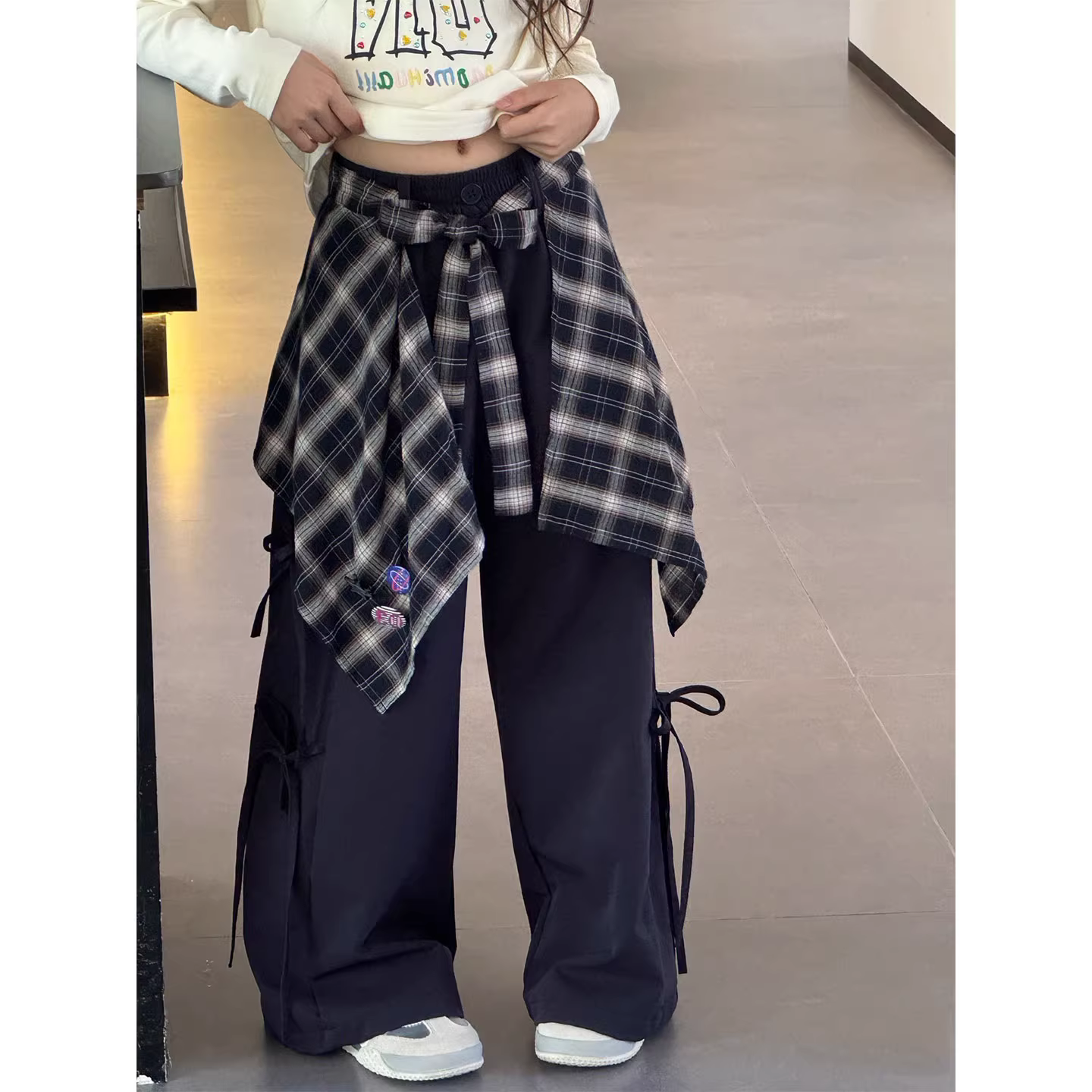 - Quần áo bảo hộ lao động cho bé gái quần dài mùa thu dáng rộng thẳng chân váy kẻ sọc quần áo trẻ em khiêu vũ đường phố phong cách cổ điển Mỹ