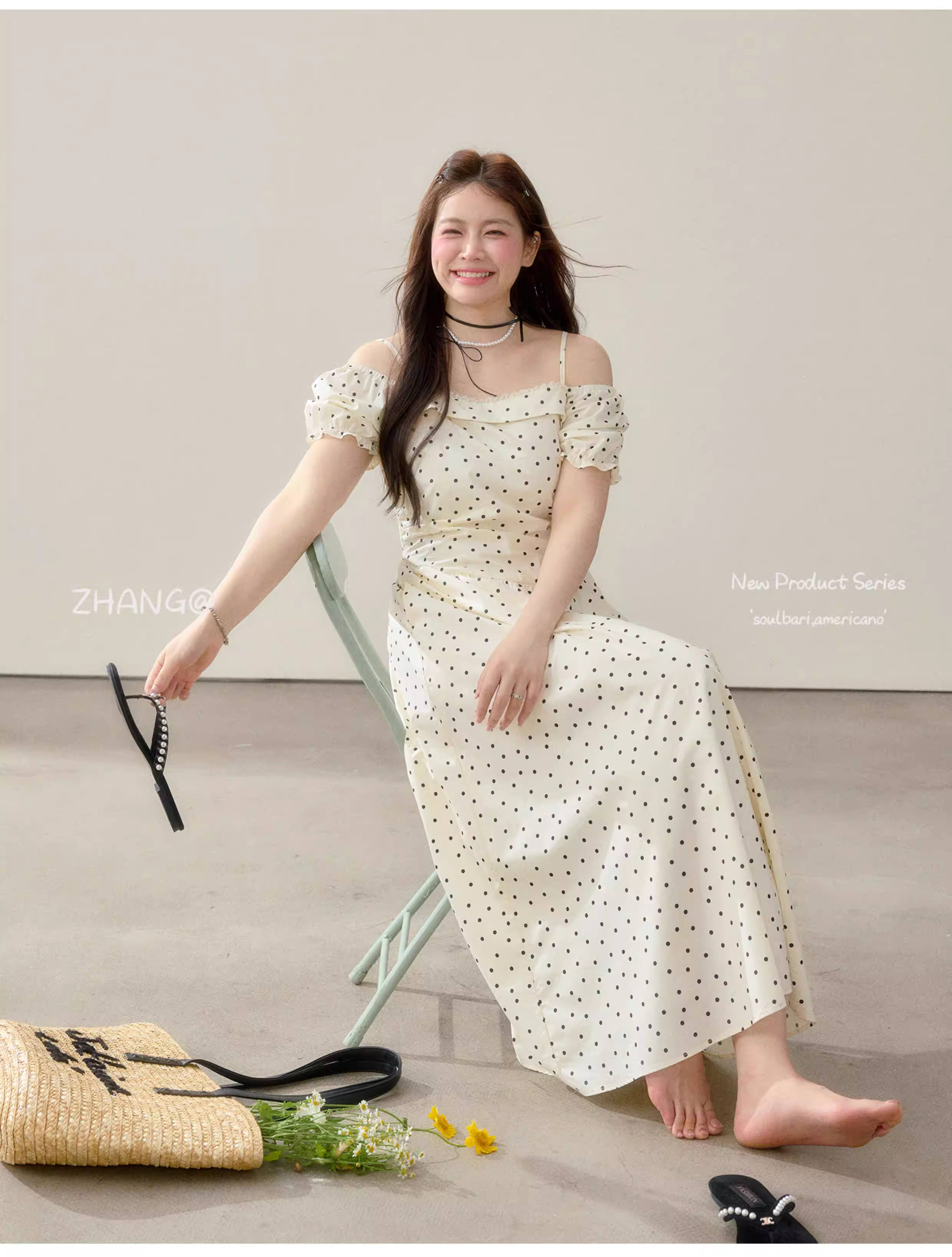 Quần áo mùa hè cỡ lớn dành cho nữ của Zhang Daren dành cho những cô nàng mũm mĩm, váy giảm béo với phong cách thuần khiết và dịu dàng, váy chấm bi lệch vai, ôm eo.