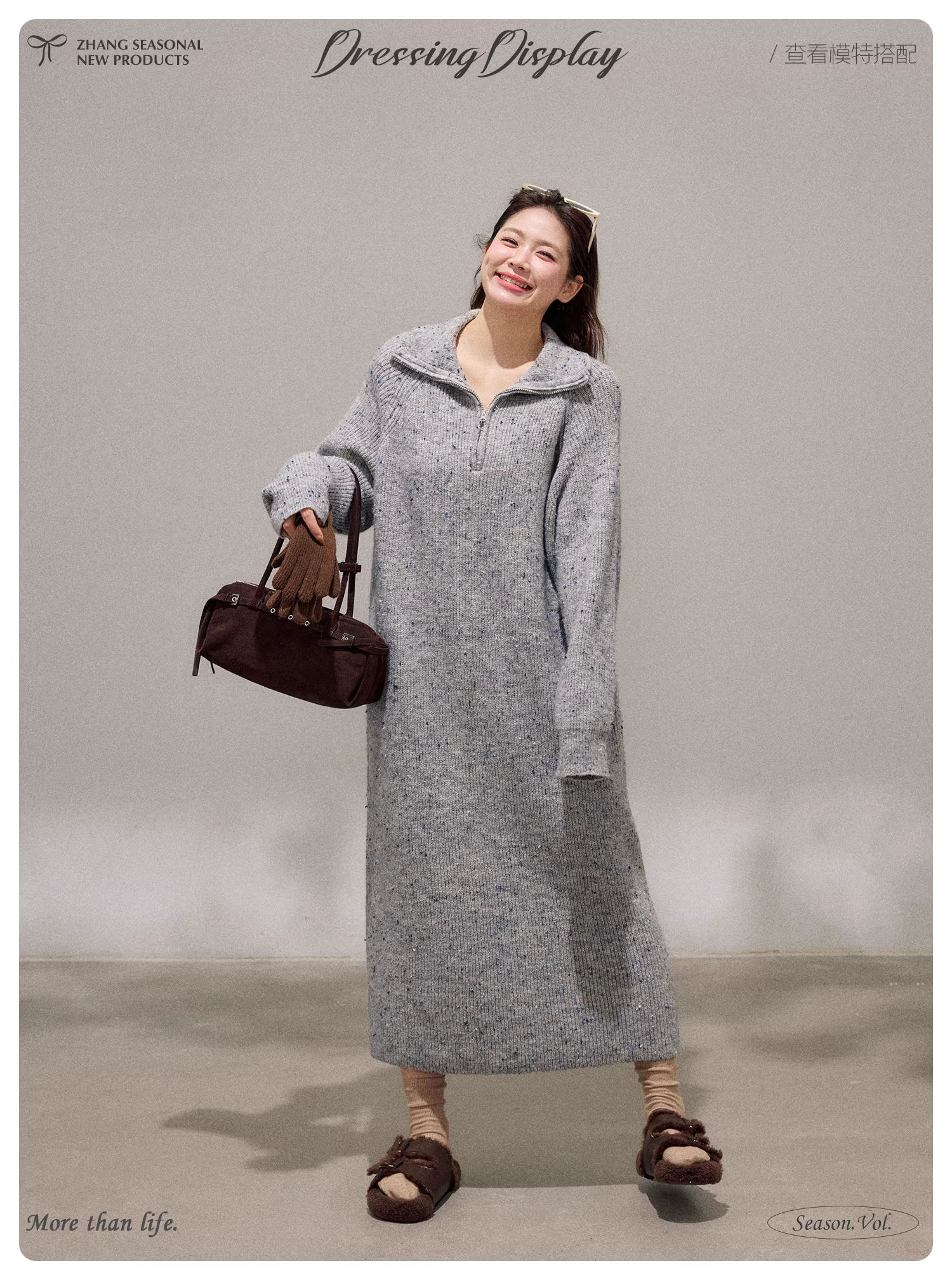 - Quần áo nữ cỡ lớn dành cho người lớn, phong cách Hàn Quốc mới về mùa đông, váy len thẳng cổ cao màu xám sọc, kiểu dáng thon gọn.