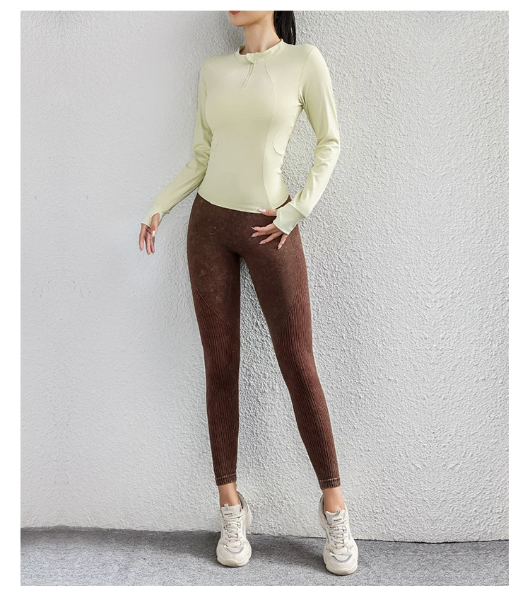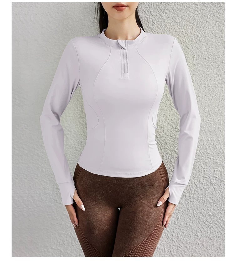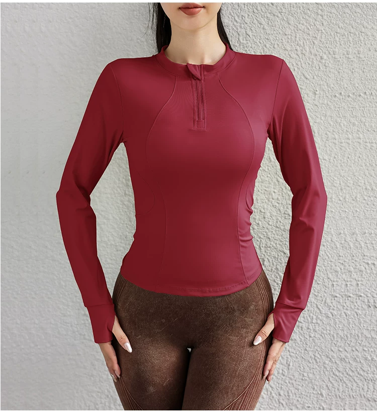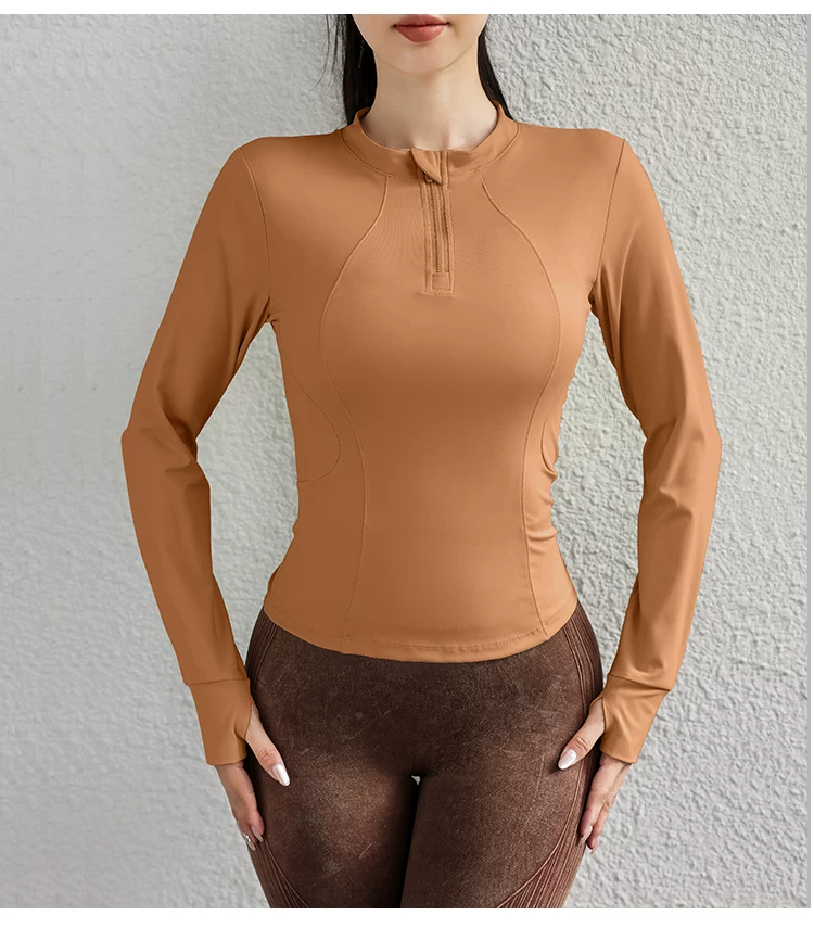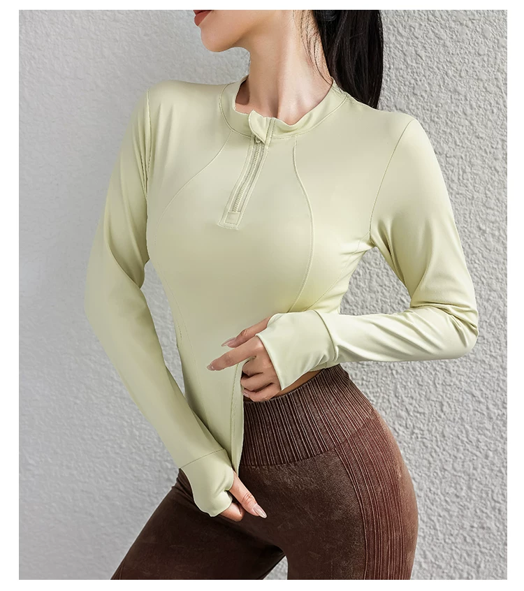 - Quần áo tập luyện chạy bộ mùa thu đông, đồ tập yoga, áo khoác ngoài, áo nửa khóa kéo, ôm sát, nhanh khô, co giãn, áo thể thao dài tay.