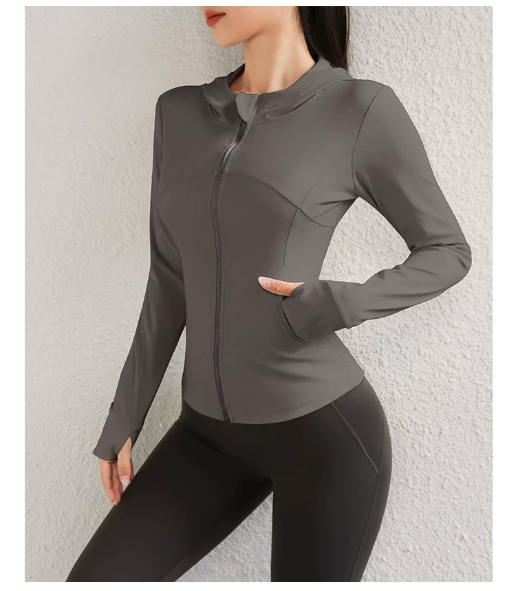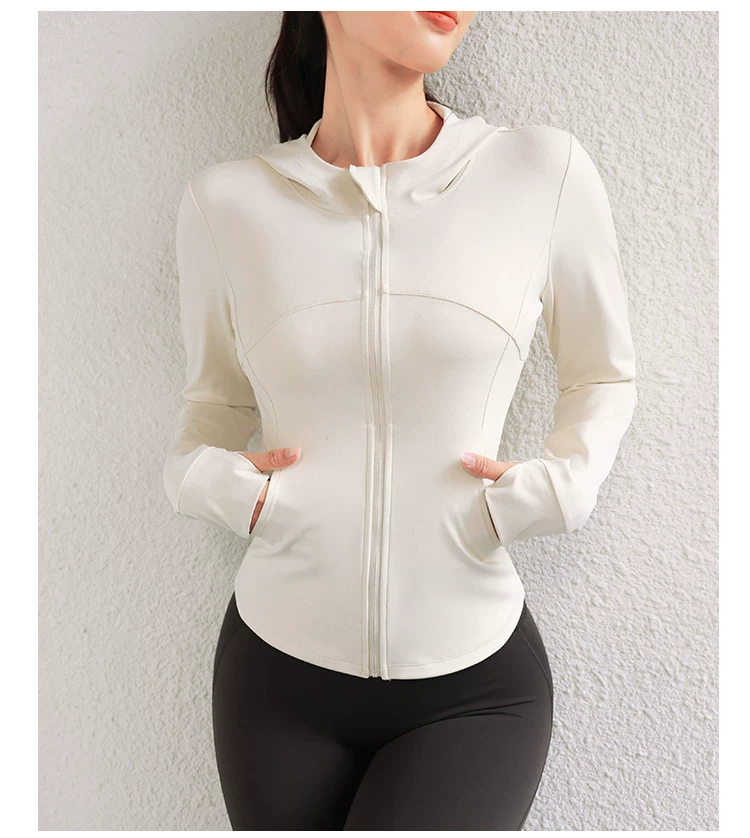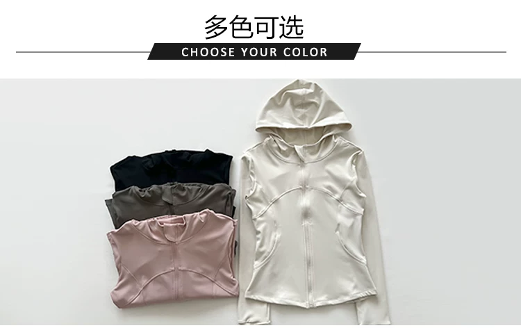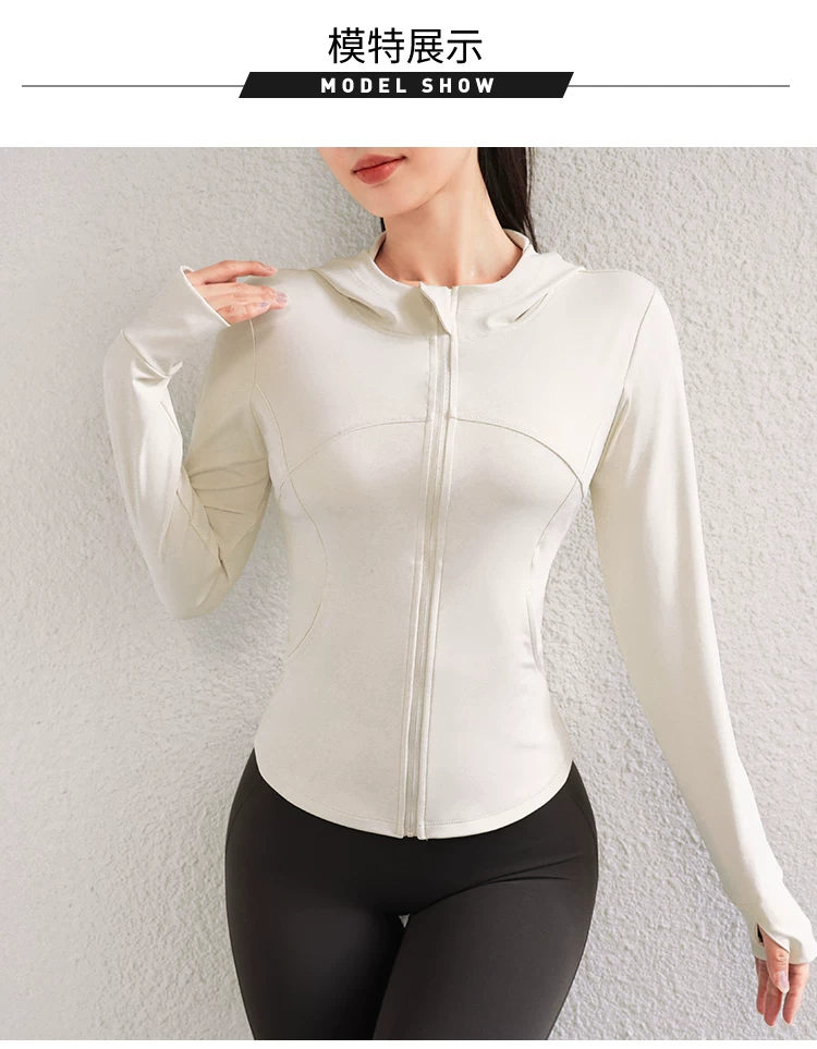 Quần áo thể dục dài tay, quần áo đạp xe, áo khoác thể thao chống gió và chống nắng, áo tập yoga ngoài trời có mũ trùm đầu cho nữ, quần áo mùa thu đông nhanh khô