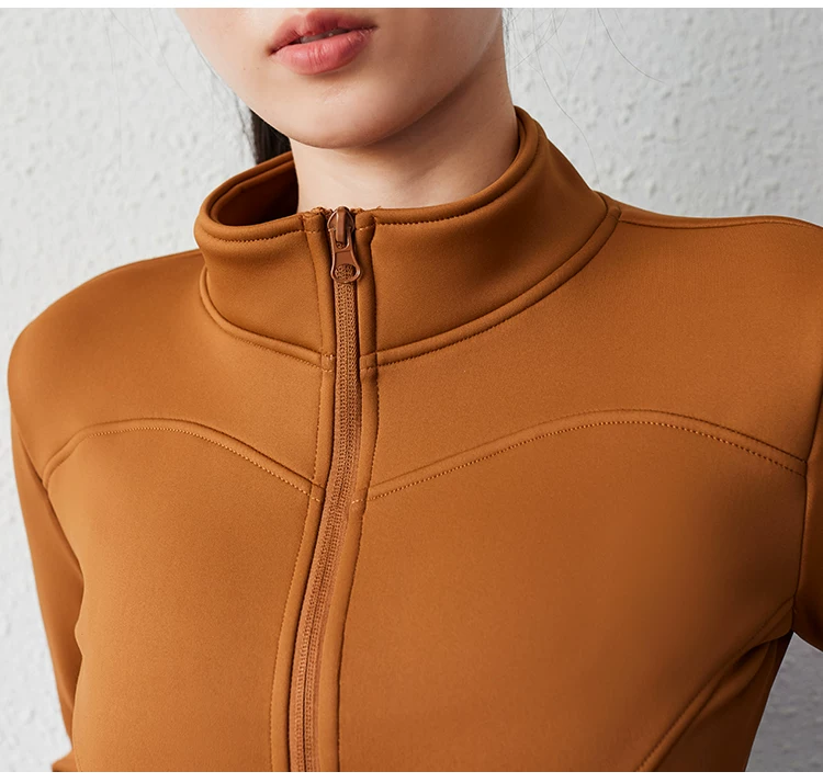 Quần áo thể thao chuyên nghiệp dành cho nữ, áo khoác thể thao chạy bộ ngắn, lót lông cừu, dày dặn, áo cardigan có khóa kéo, áo cổ đứng, áo dài tay tập yoga.