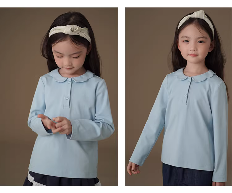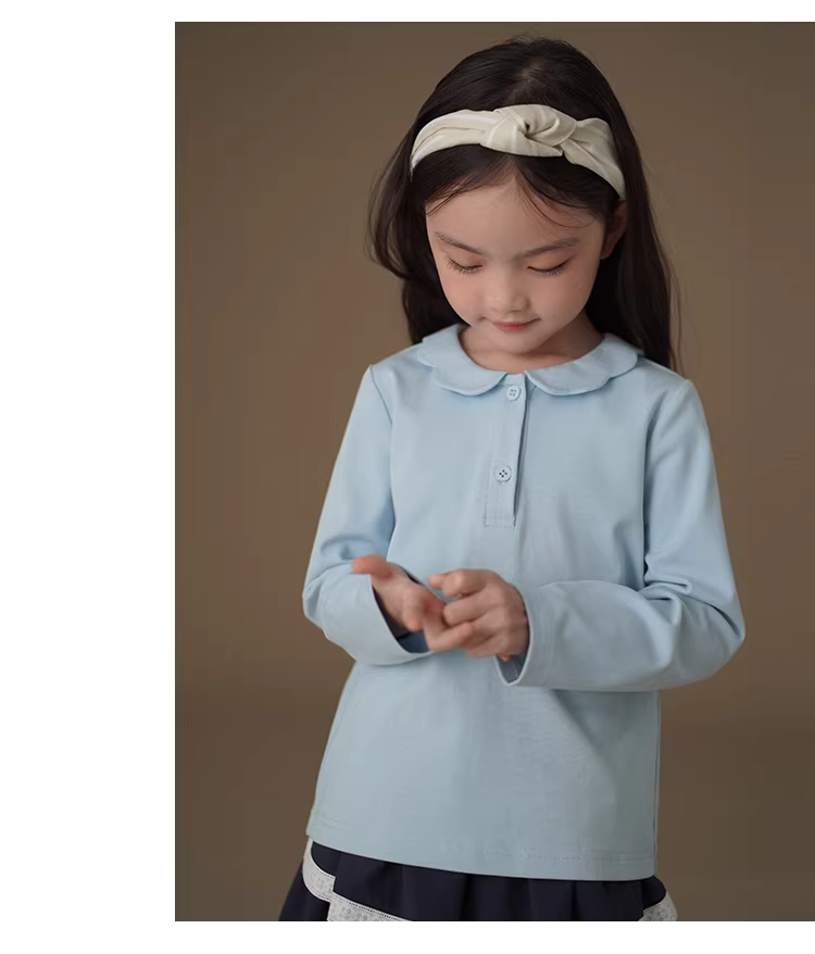 - Quần áo trẻ em Hazi Áo sơ mi dài tay mùa xuân thu màu xanh da trời đơn giản kiểu dáng ôm sát dệt kim Áo bé gái mặc mùa xuân 2025 kiểu mới