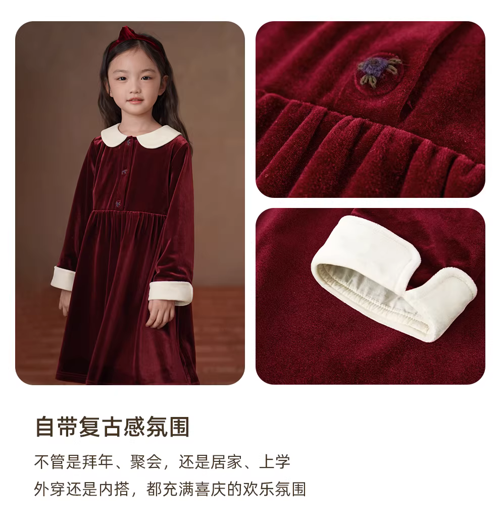 - Quần áo trẻ em Hazi Váy dài vừa phải cho trẻ em mùa đông Váy nhung màu đỏ tía cổ điển Váy bé gái Váy năm mới của bé gái