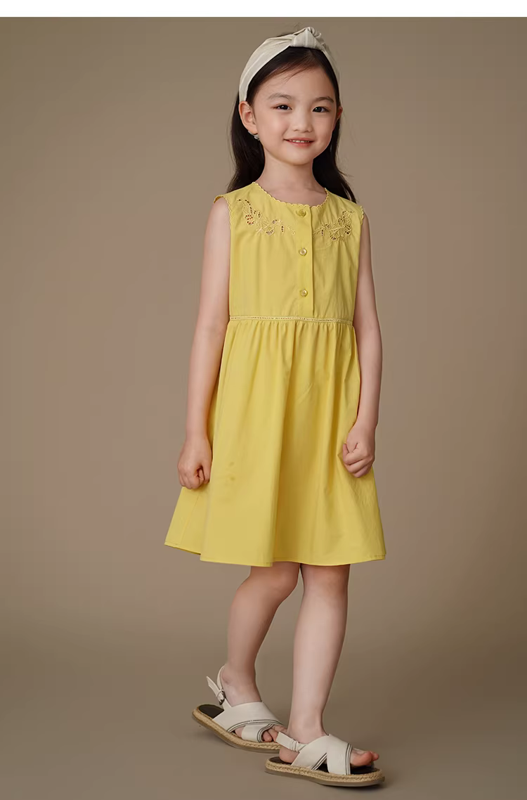 - Quần áo trẻ em Hazi Váy midi thêu màu vàng cho bé gái, Váy ba lỗ cho trẻ lớn hơn, Trang phục mùa hè, Thoáng mát và thoáng khí