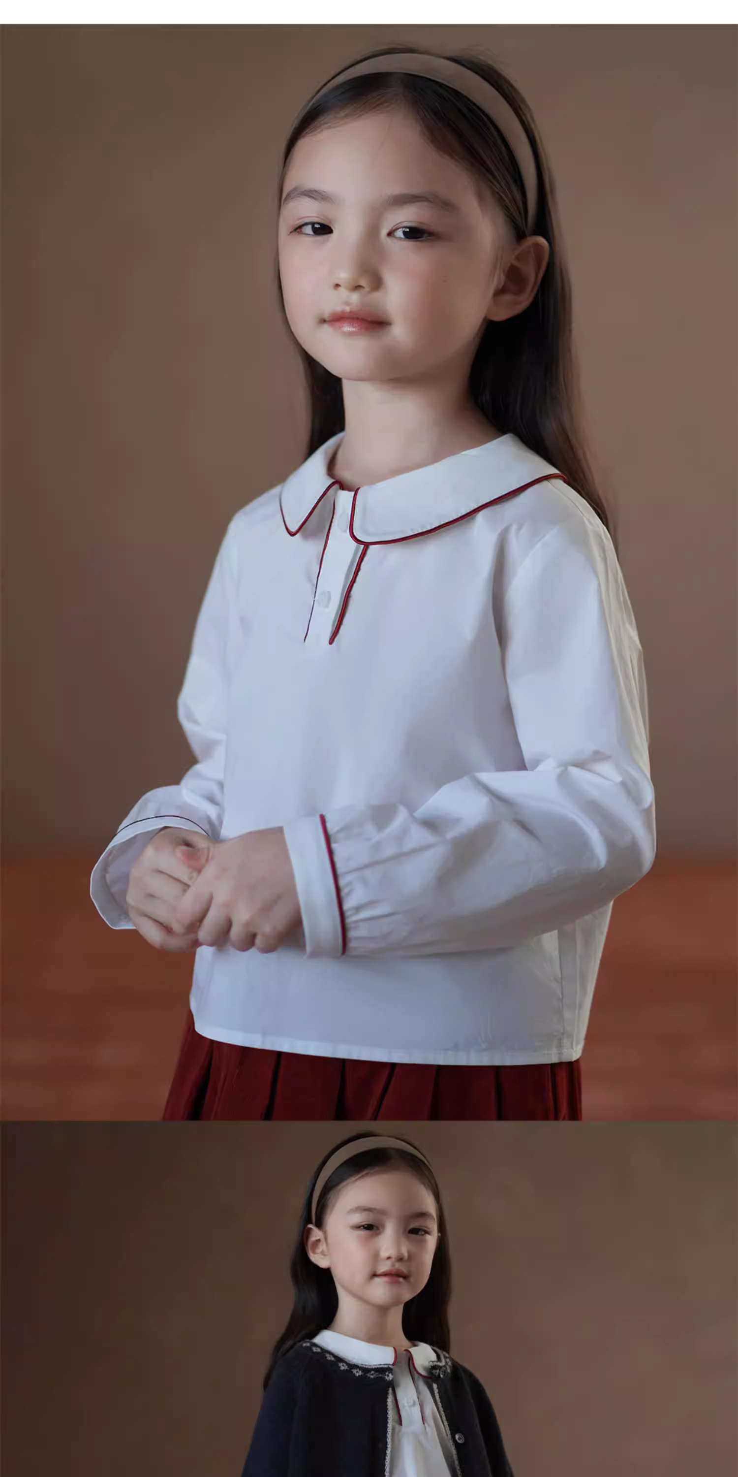 - Quần áo trẻ em mùa xuân thu áo sơ mi trắng phong cách học sinh áo búp bê áo bé gái phối màu áo đơn giản cao cấp áo lót