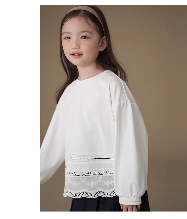 - Quần áo trẻ em mùa xuân thu áo thun dài tay màu trắng dệt kim chắp vá ren rỗng áo bé gái đơn giản và phong cách
