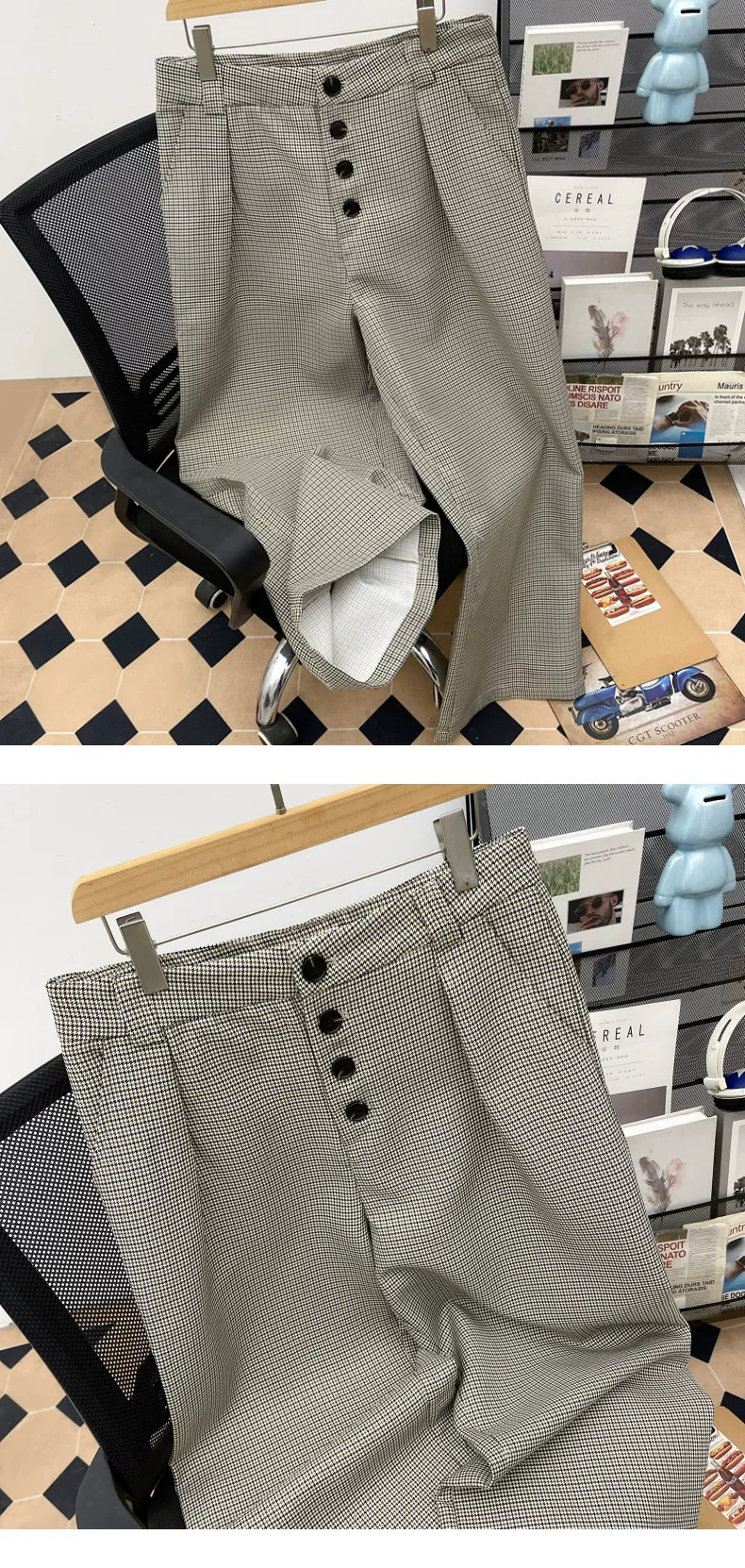 - Quần âu nam họa tiết răng cưa, quần ống rộng thời trang xuân thu, quần thẳng phong cách old money retro.