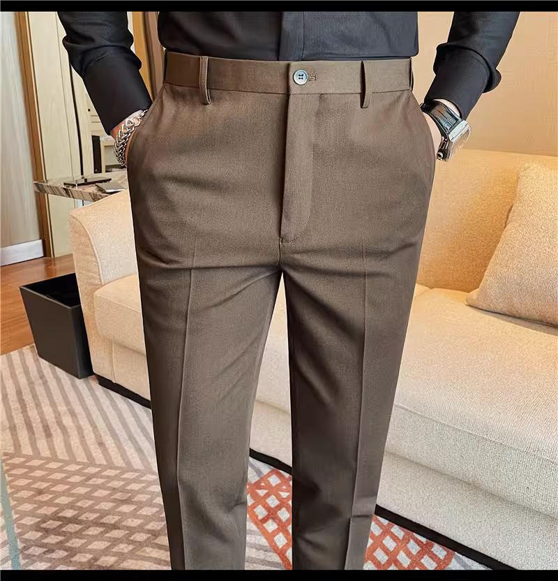 Quần âu nam kiểu dáng mới mùa xuân thu, chất liệu trơn màu, đa năng, thời trang, ôm dáng, ống côn, lưng thun.