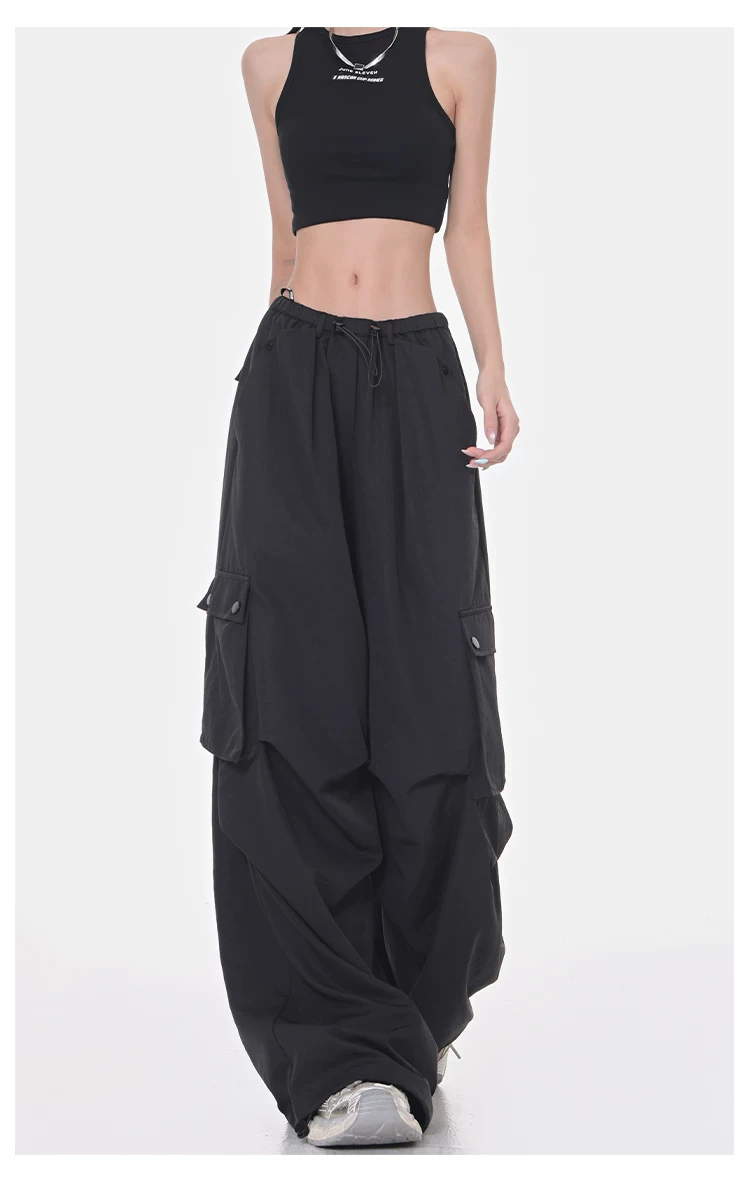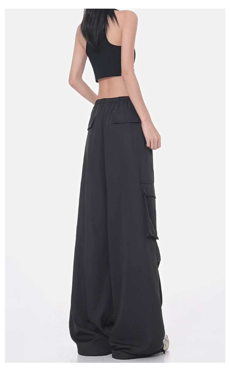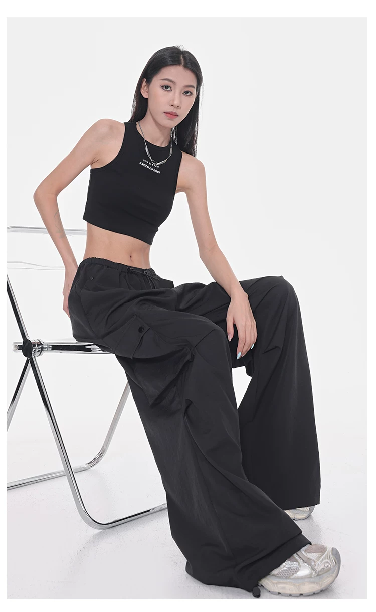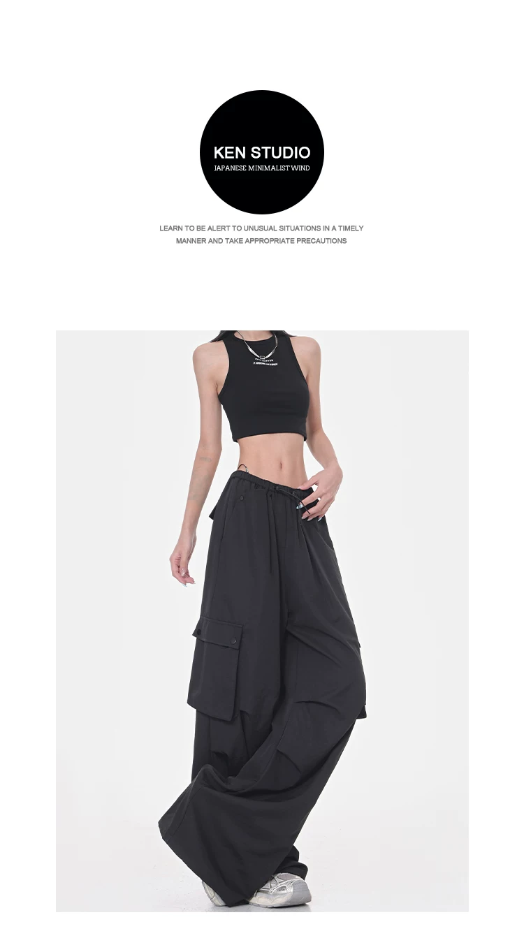 Quần cargo ống rộng màu đen của KEN STUDIO dành cho nữ, quần ống đứng mỏng mùa hè, quần thể thao nhanh khô, quần lính dù