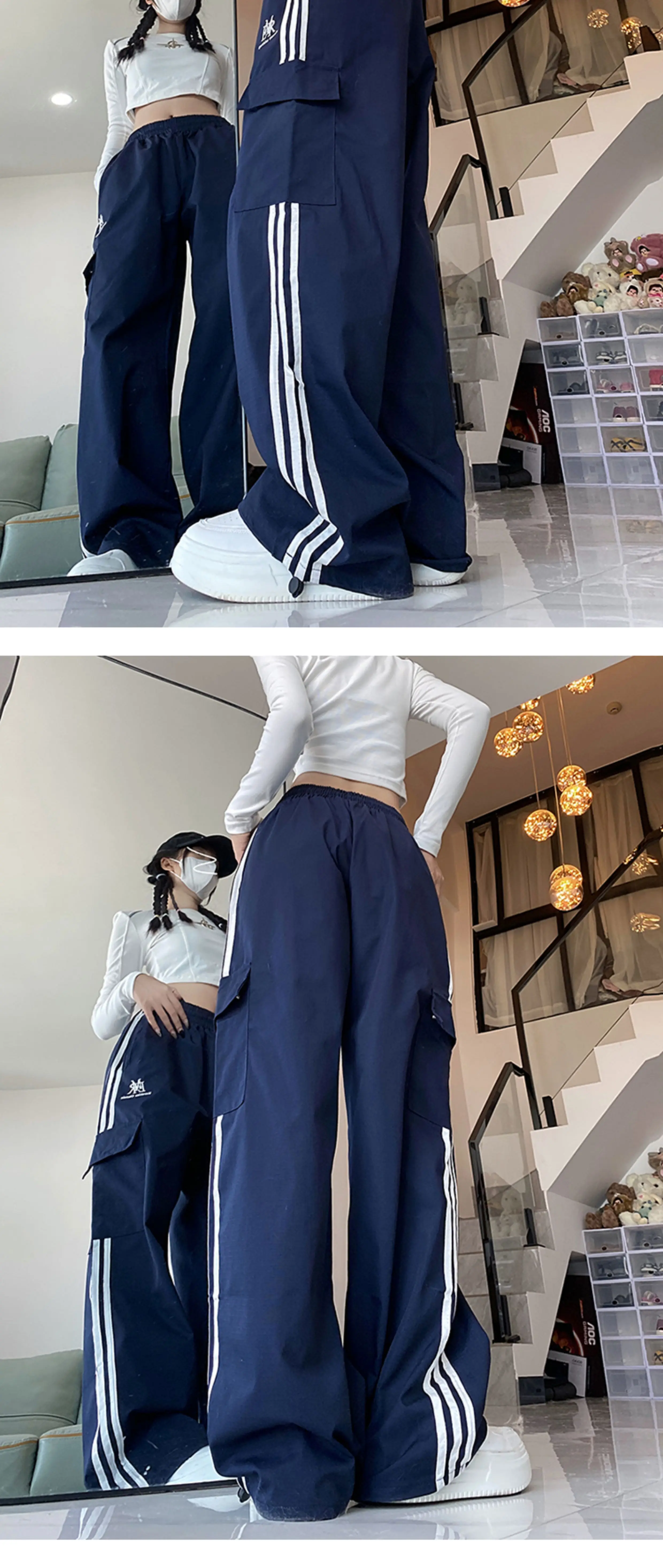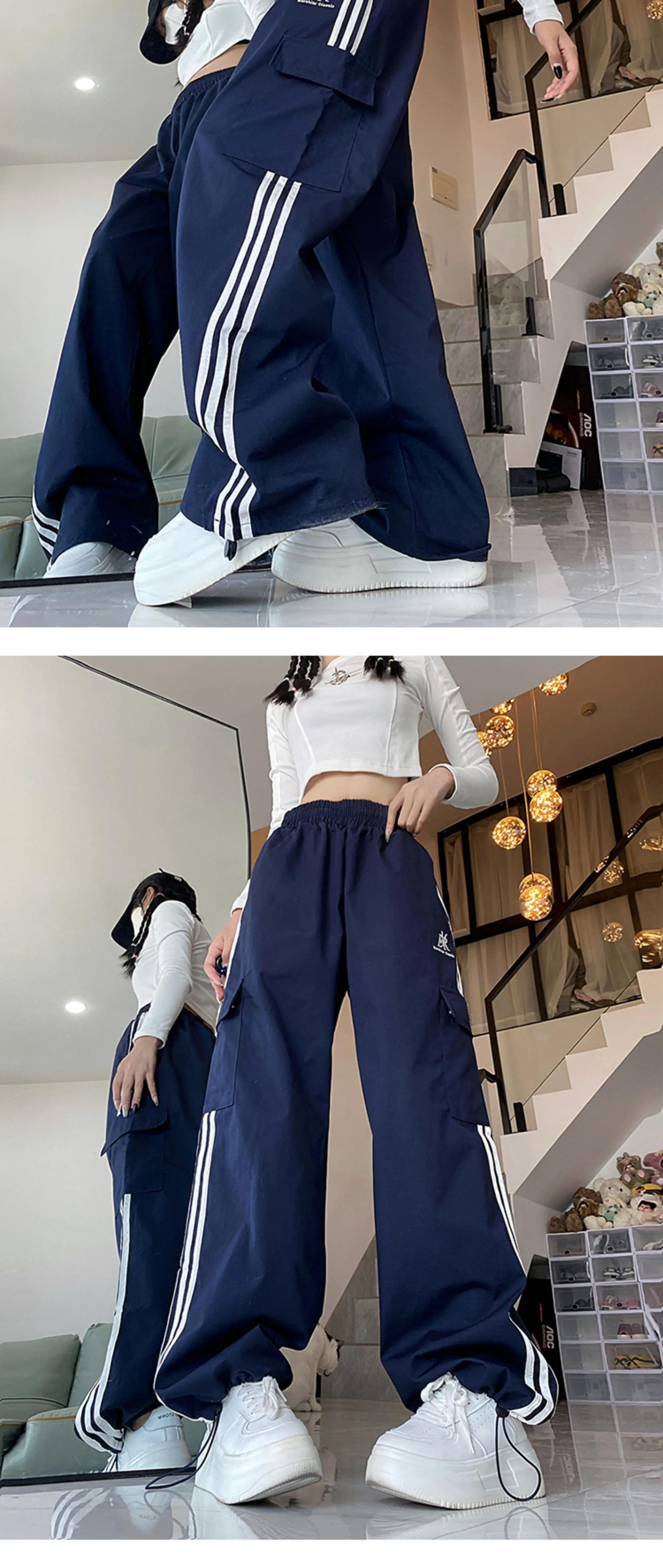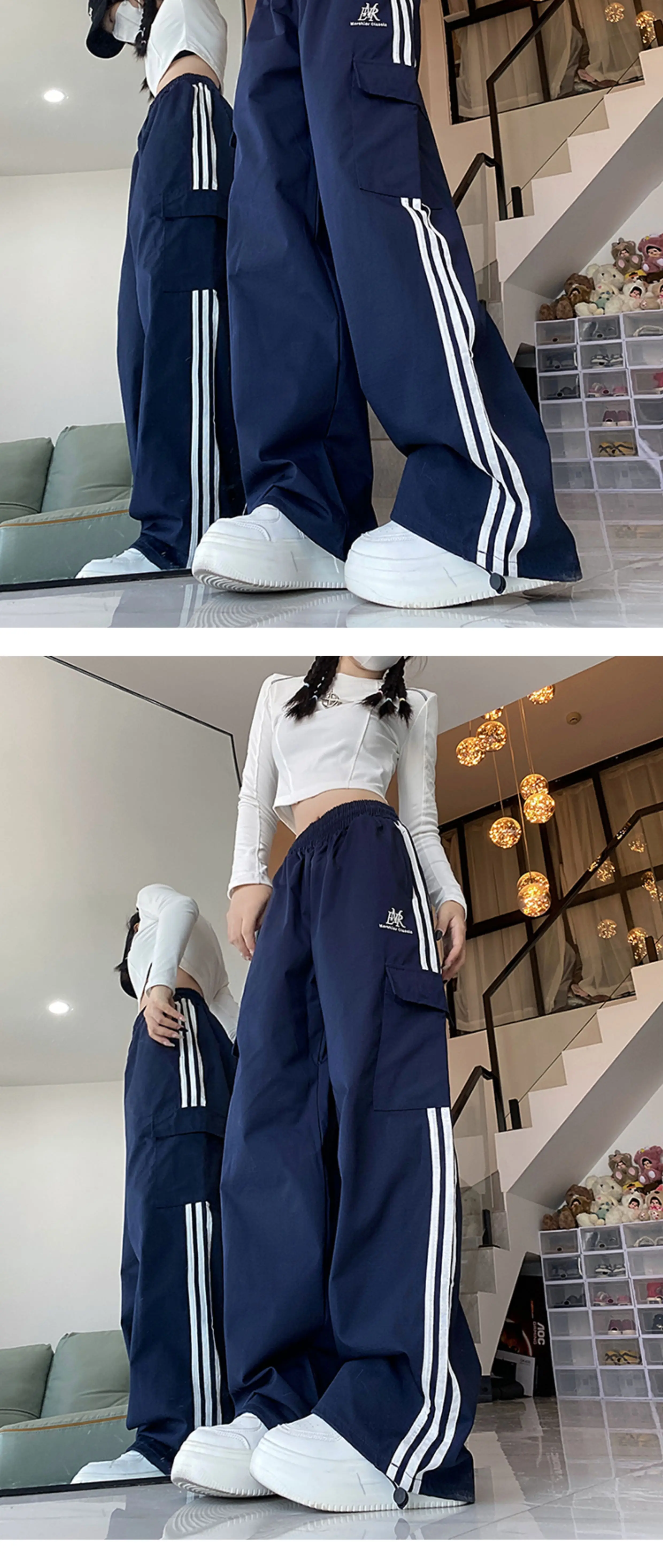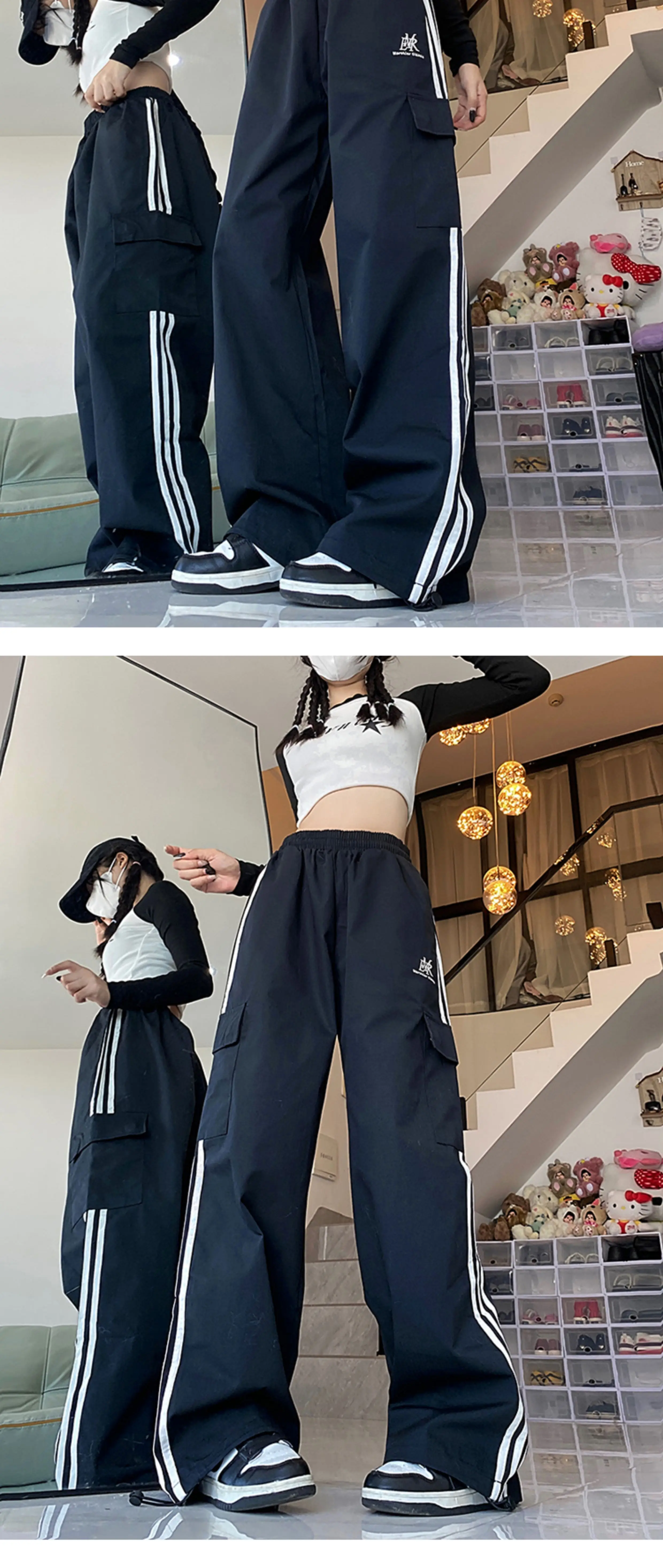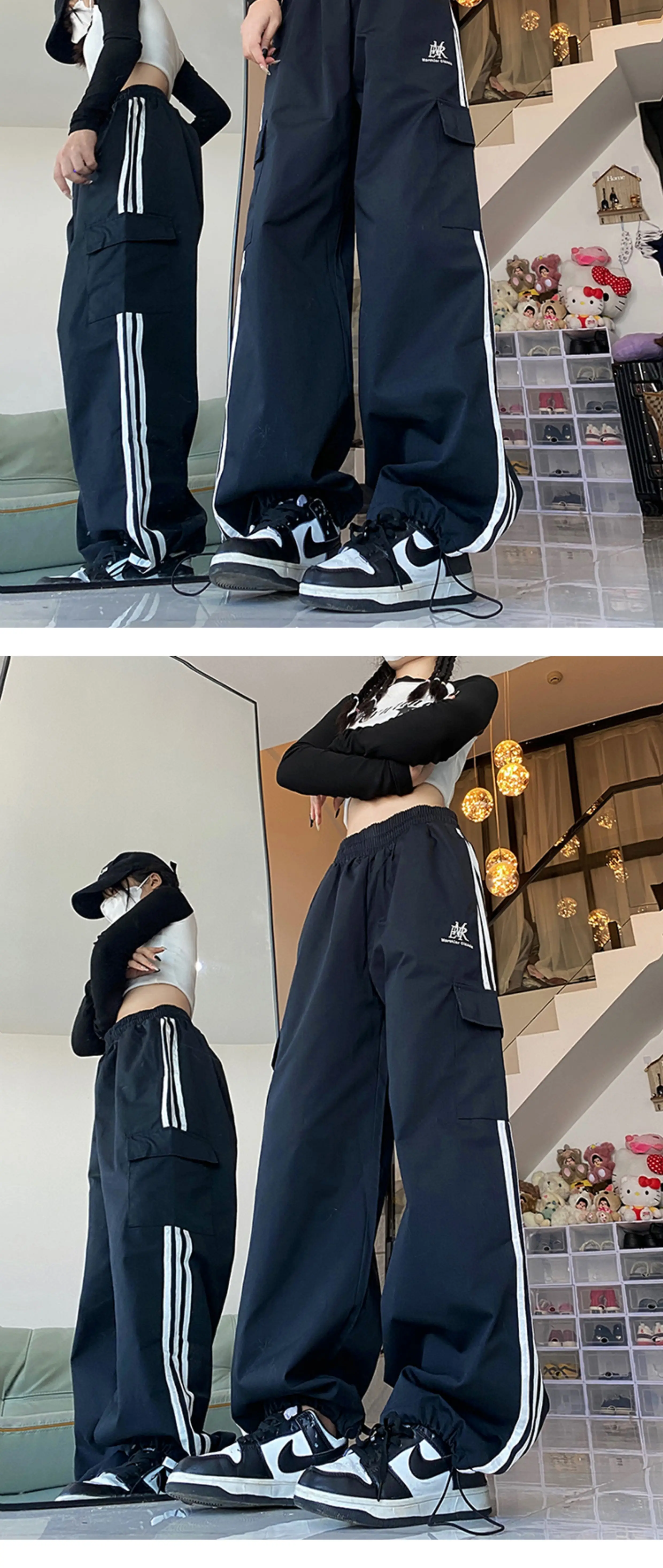 - Quần cargo ống rộng sọc ngang phong cách Mỹ, quần đôi unisex thời trang đường phố, quần ống đứng dài chạm đất mùa hè, phong cách thường ngày