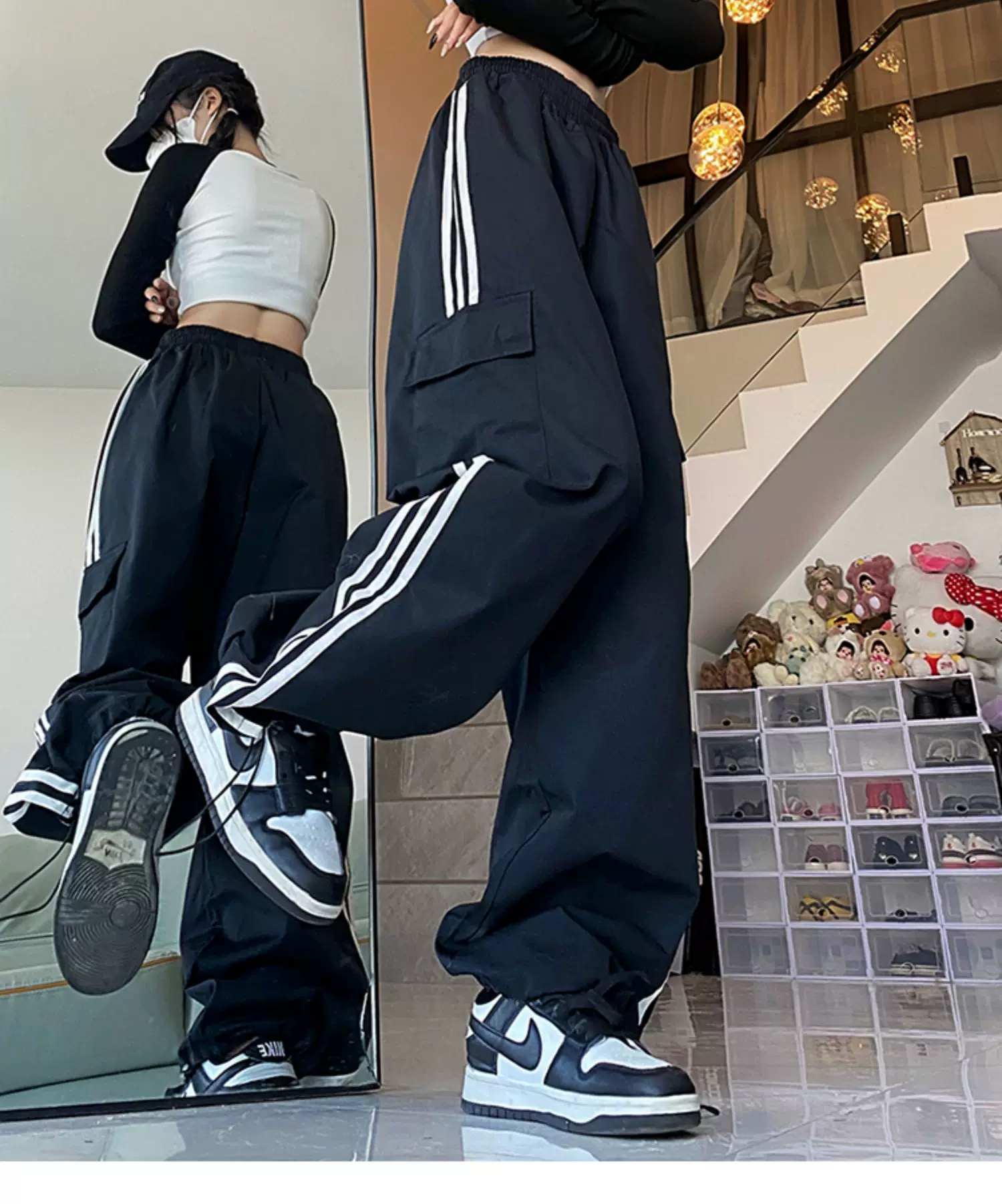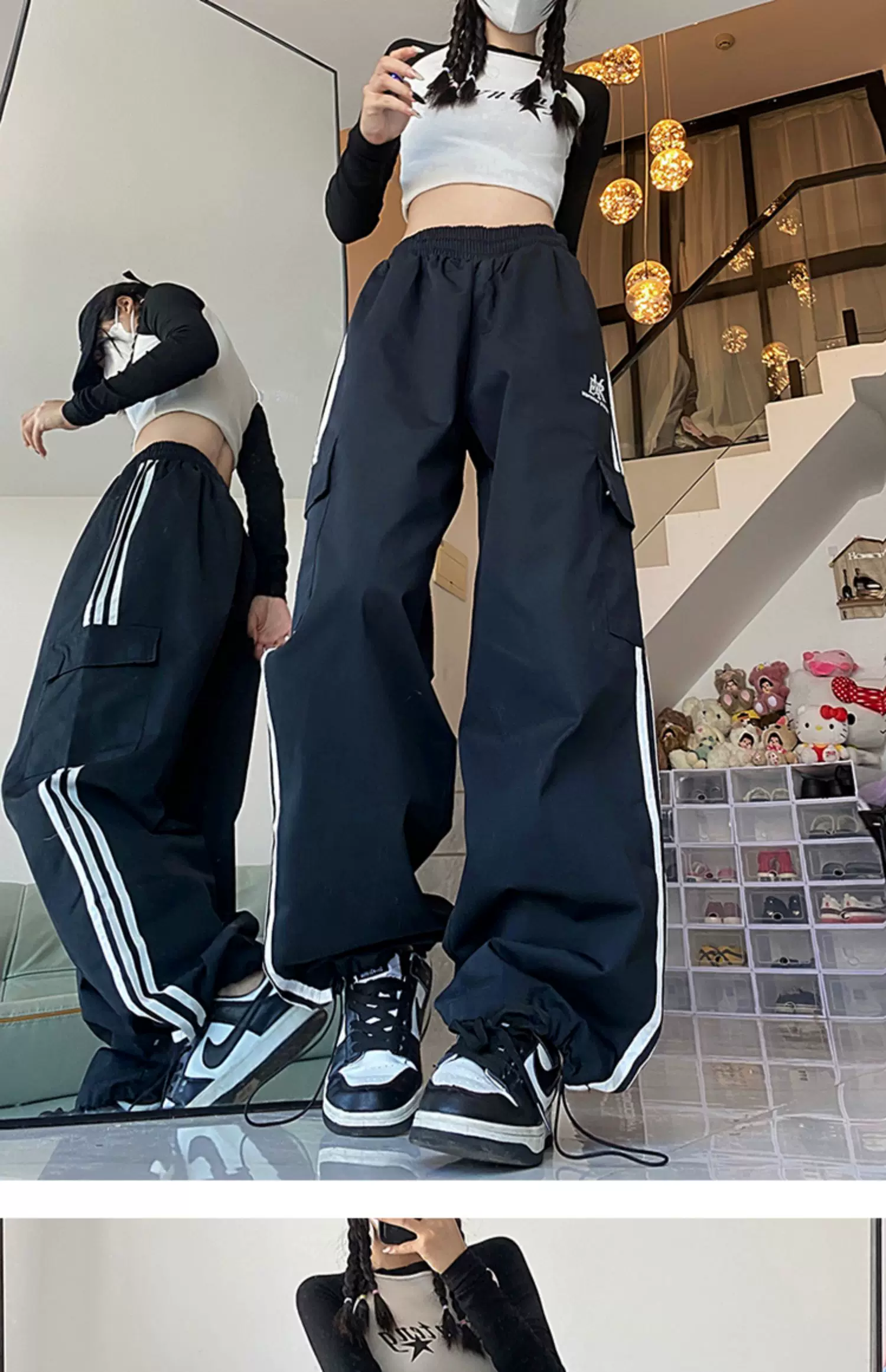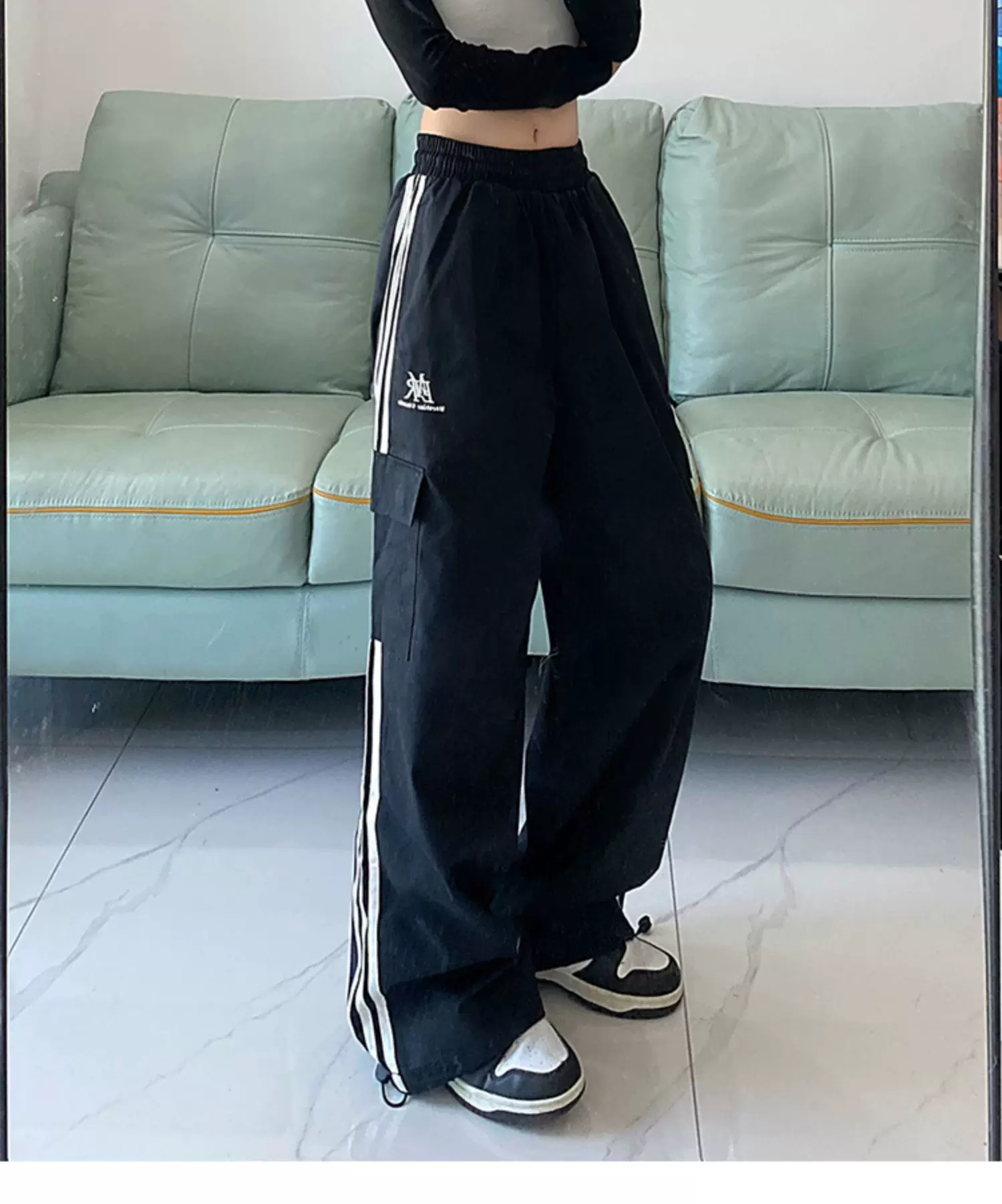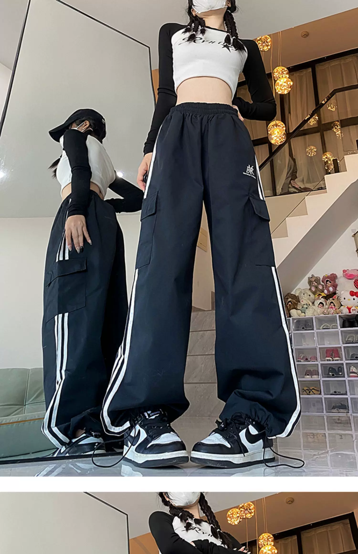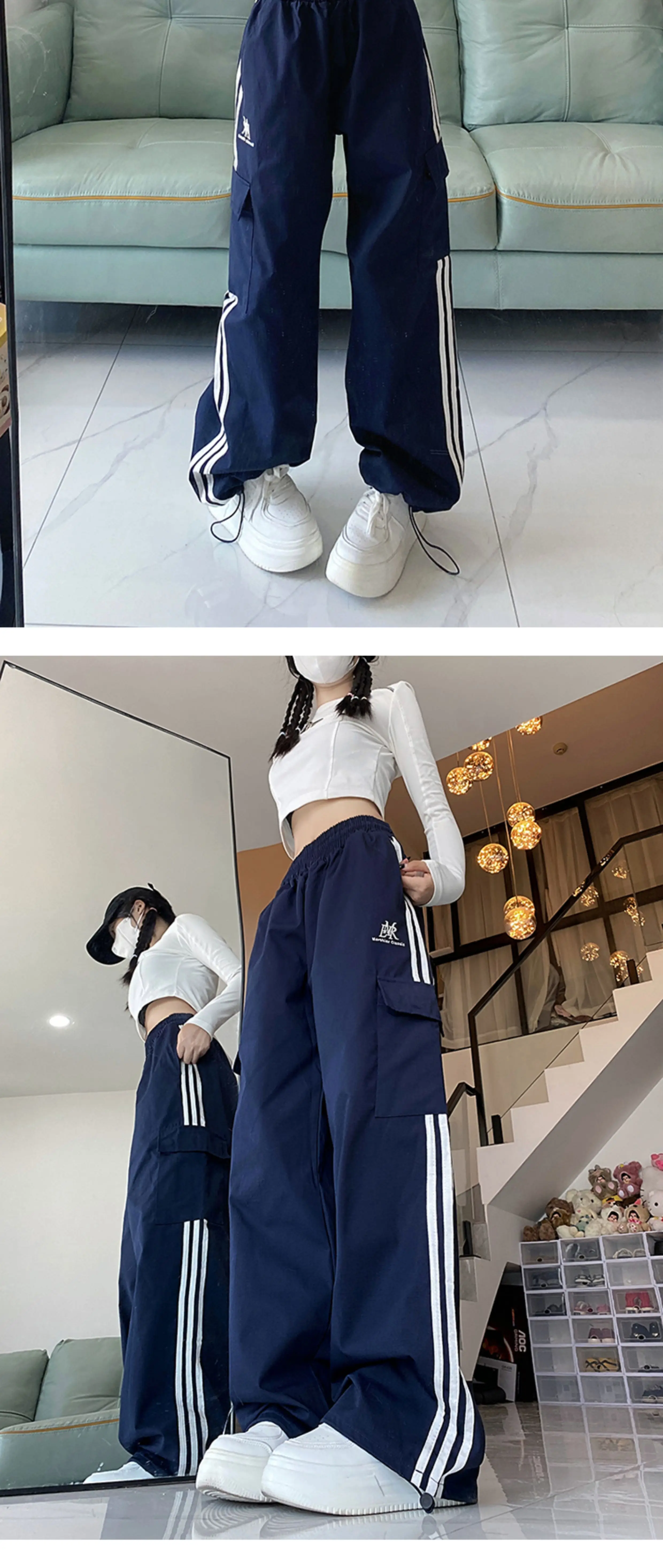 - Quần cargo ống rộng sọc ngang phong cách Mỹ, quần đôi unisex thời trang đường phố, quần ống đứng dài chạm đất mùa hè, phong cách thường ngày
