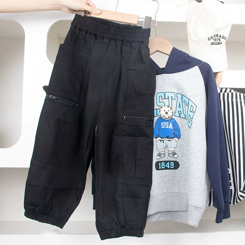 Quần cargo túi lớn cho bé trai, quần cotton dệt thông thường, kiểu dáng xuân thu mới, quần dài rộng rãi cho trẻ lớn, kiểu dáng thời thượng.