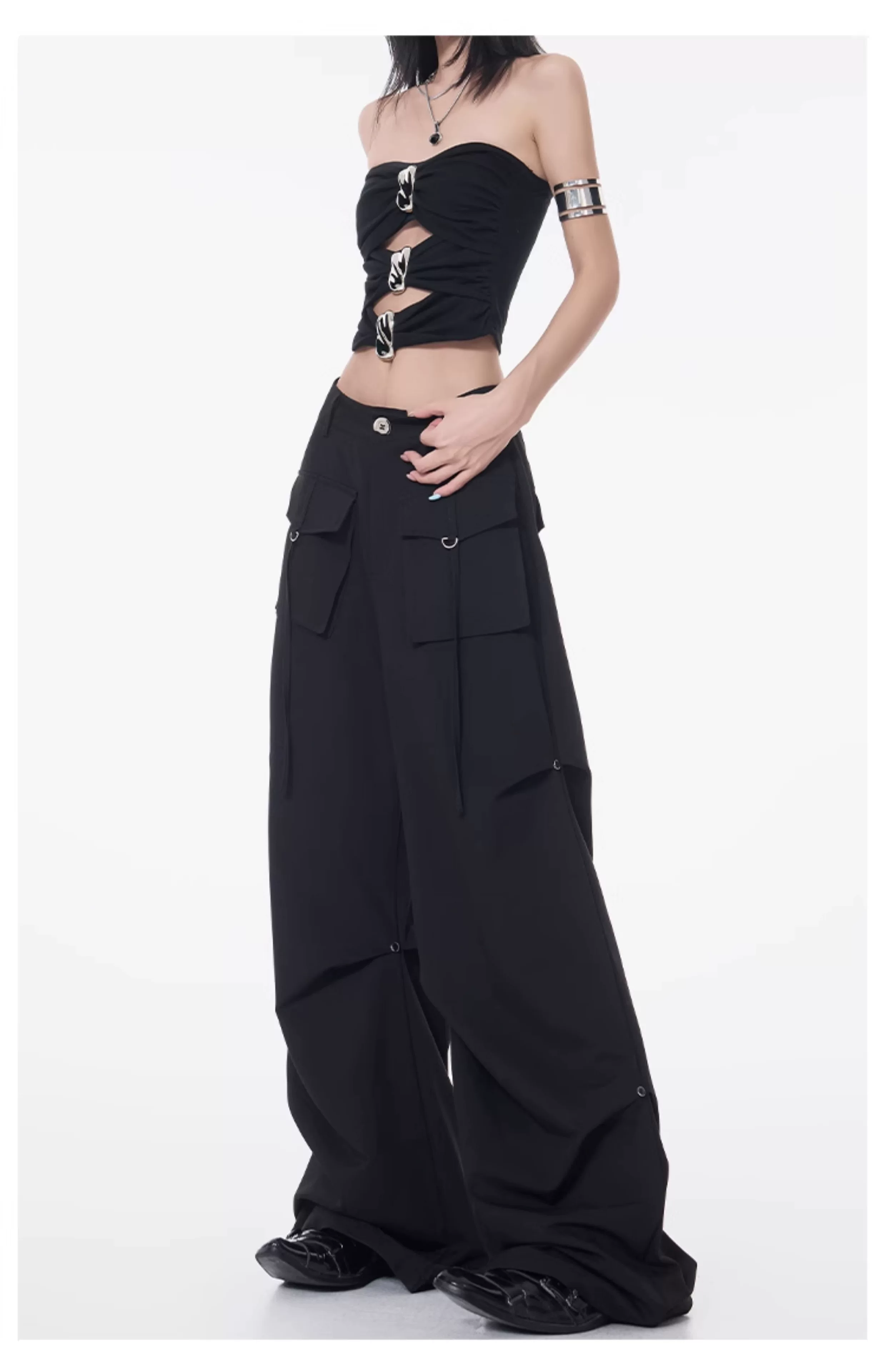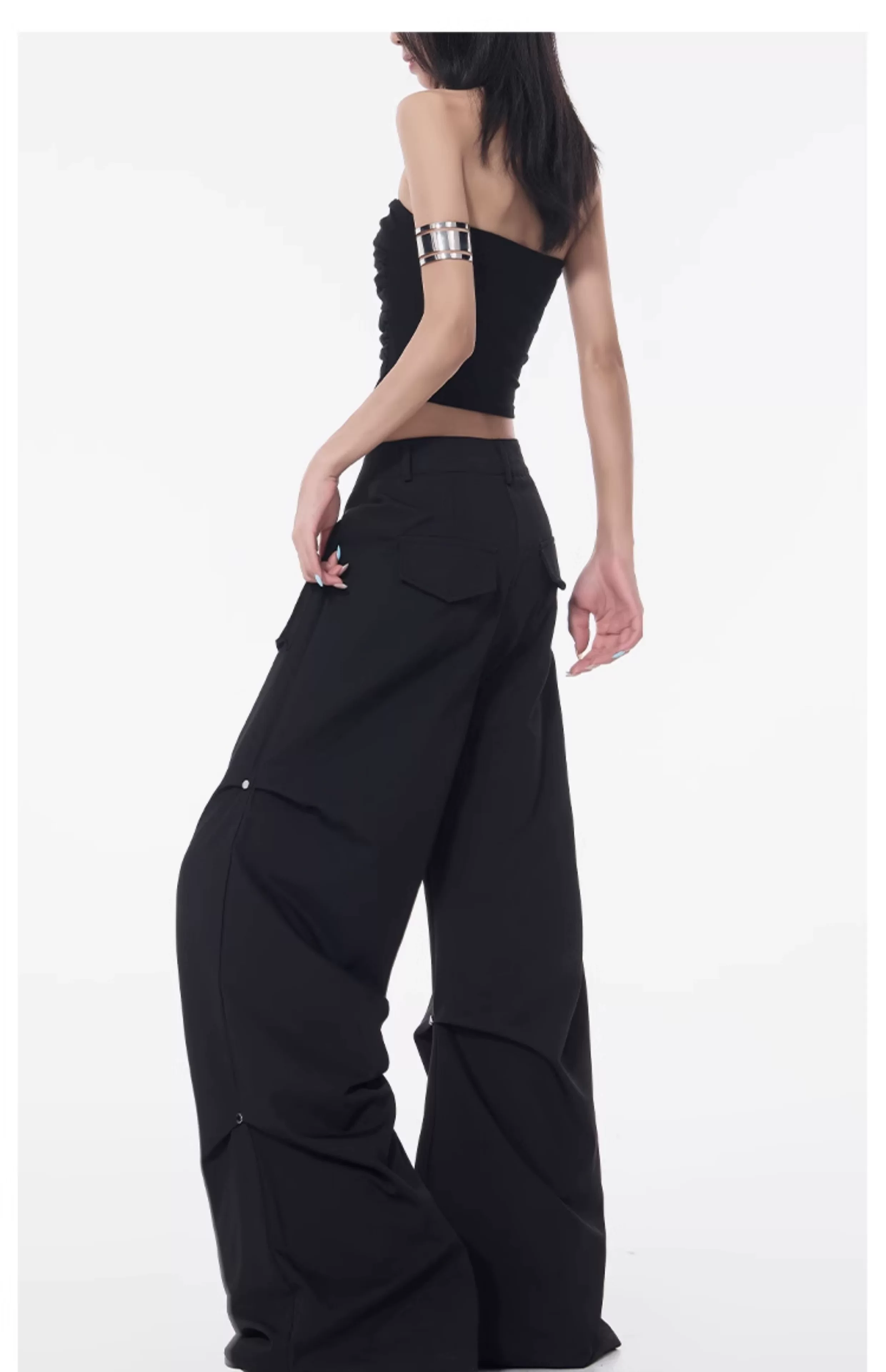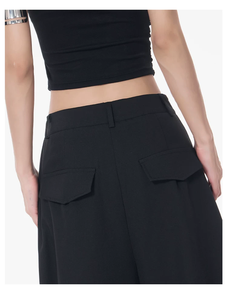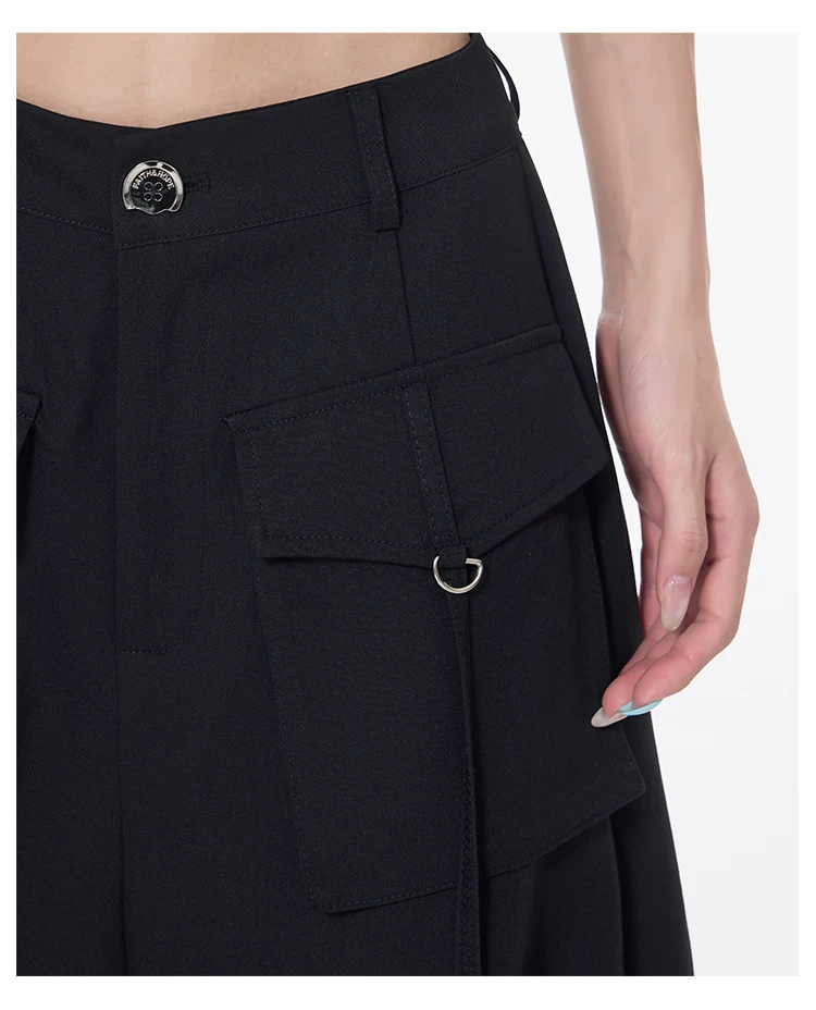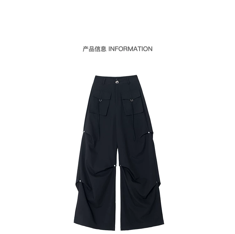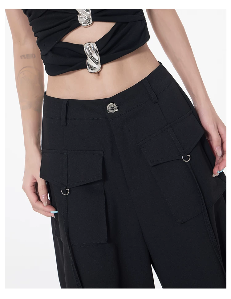 Quần cargo xếp ly màu đen phong cách đường phố KEN STUDIO dành cho nữ, quần dài dáng rộng lưng cao mới mùa hè