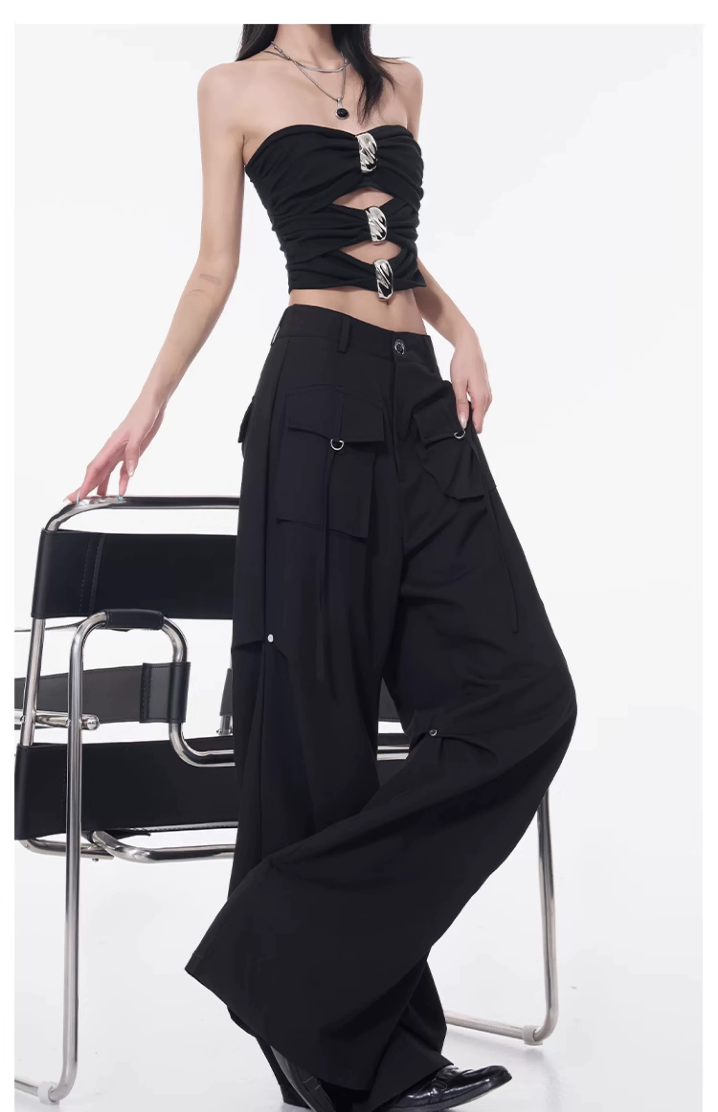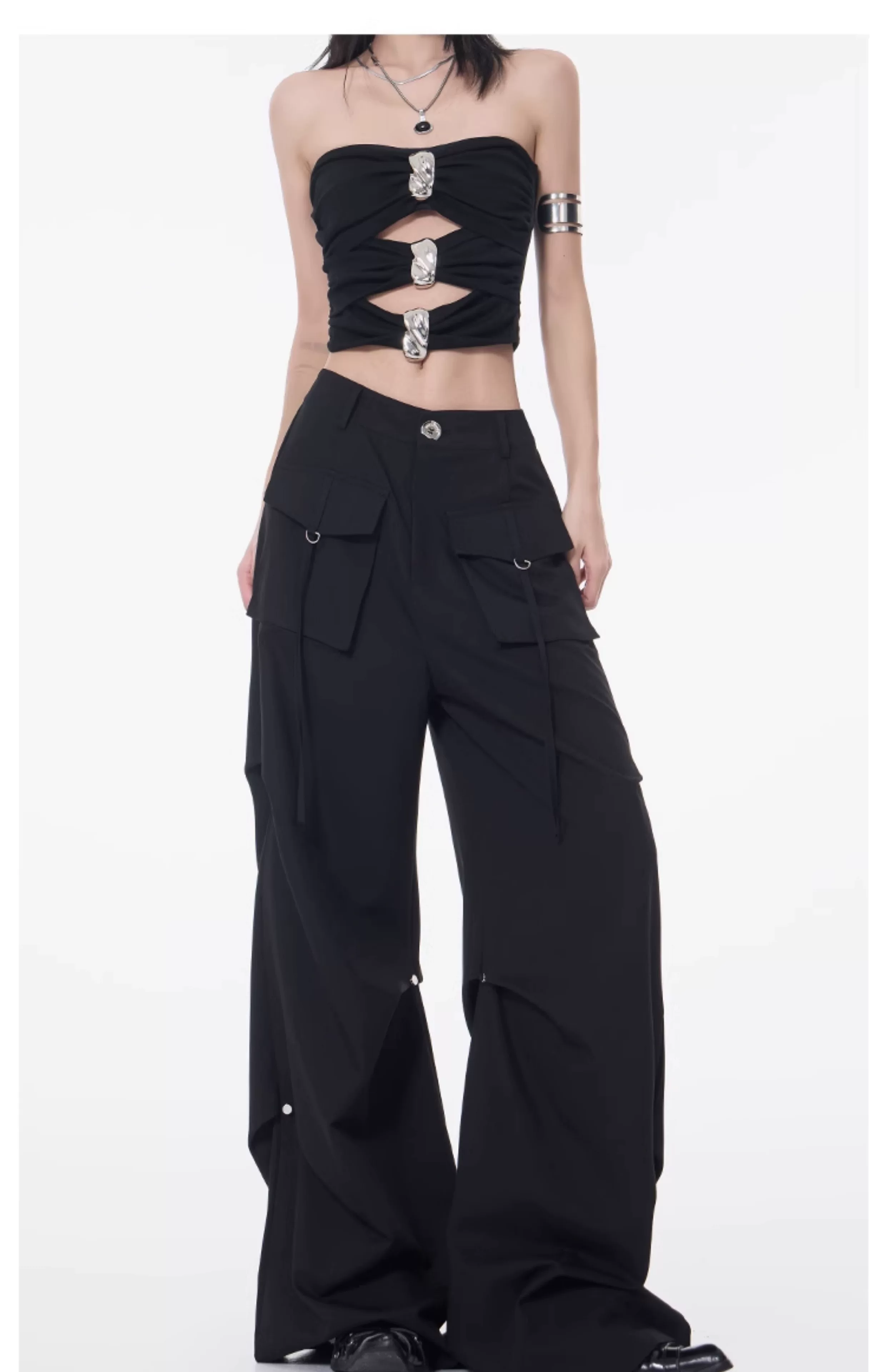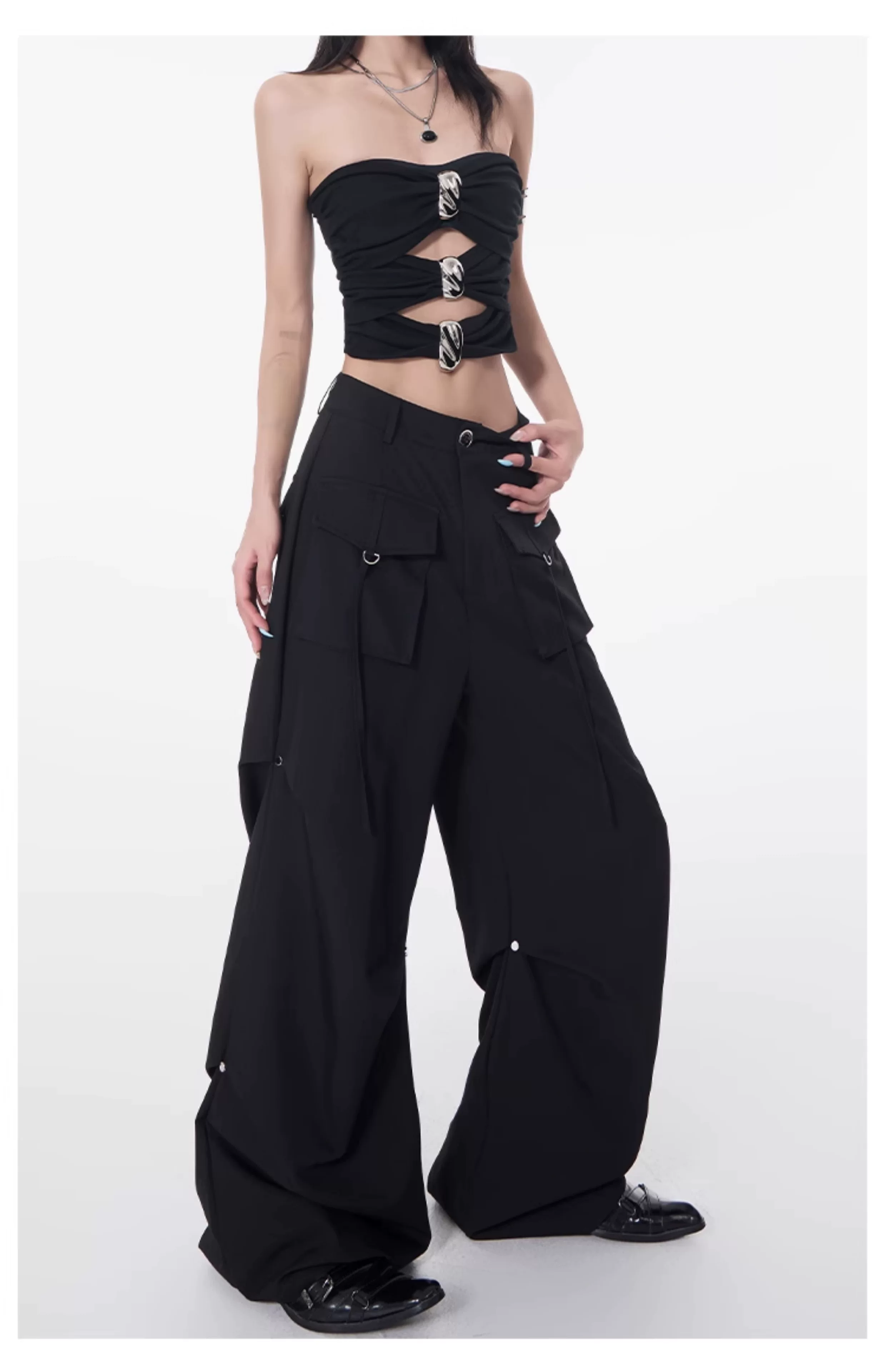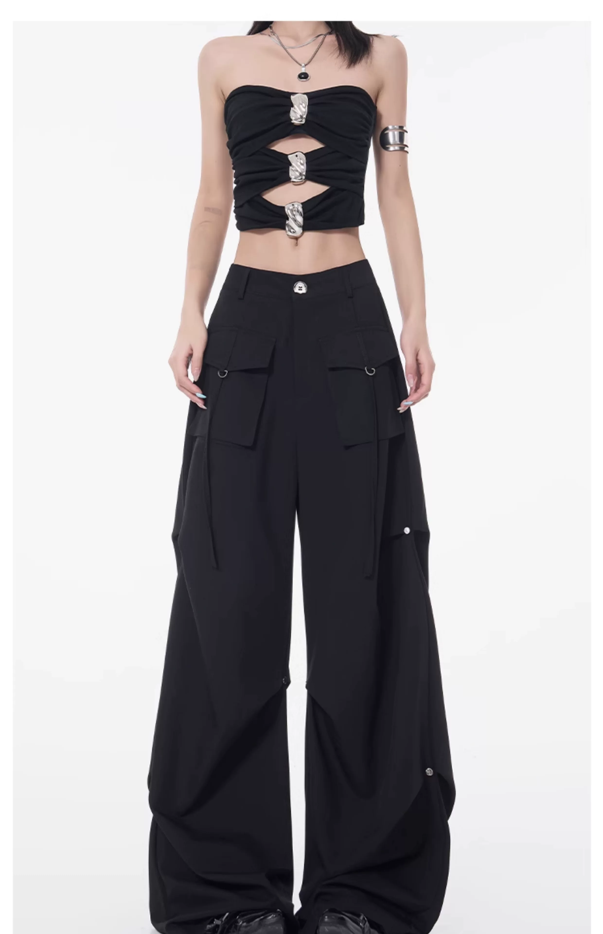 Quần cargo xếp ly màu đen phong cách đường phố KEN STUDIO dành cho nữ, quần dài dáng rộng lưng cao mới mùa hè